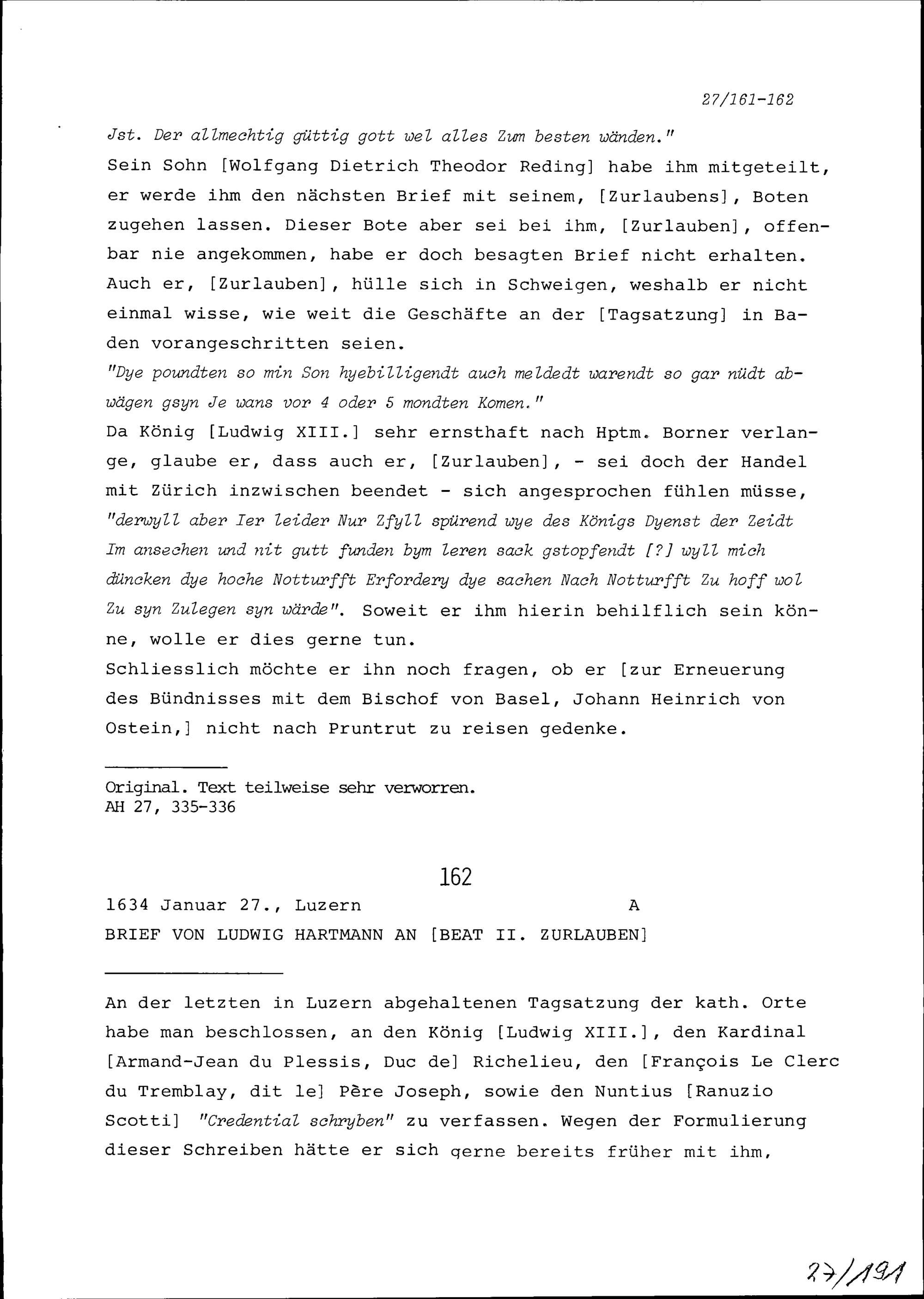 Schreiben von Heinrich Reding an Beat II. Zurlauben, Ammann