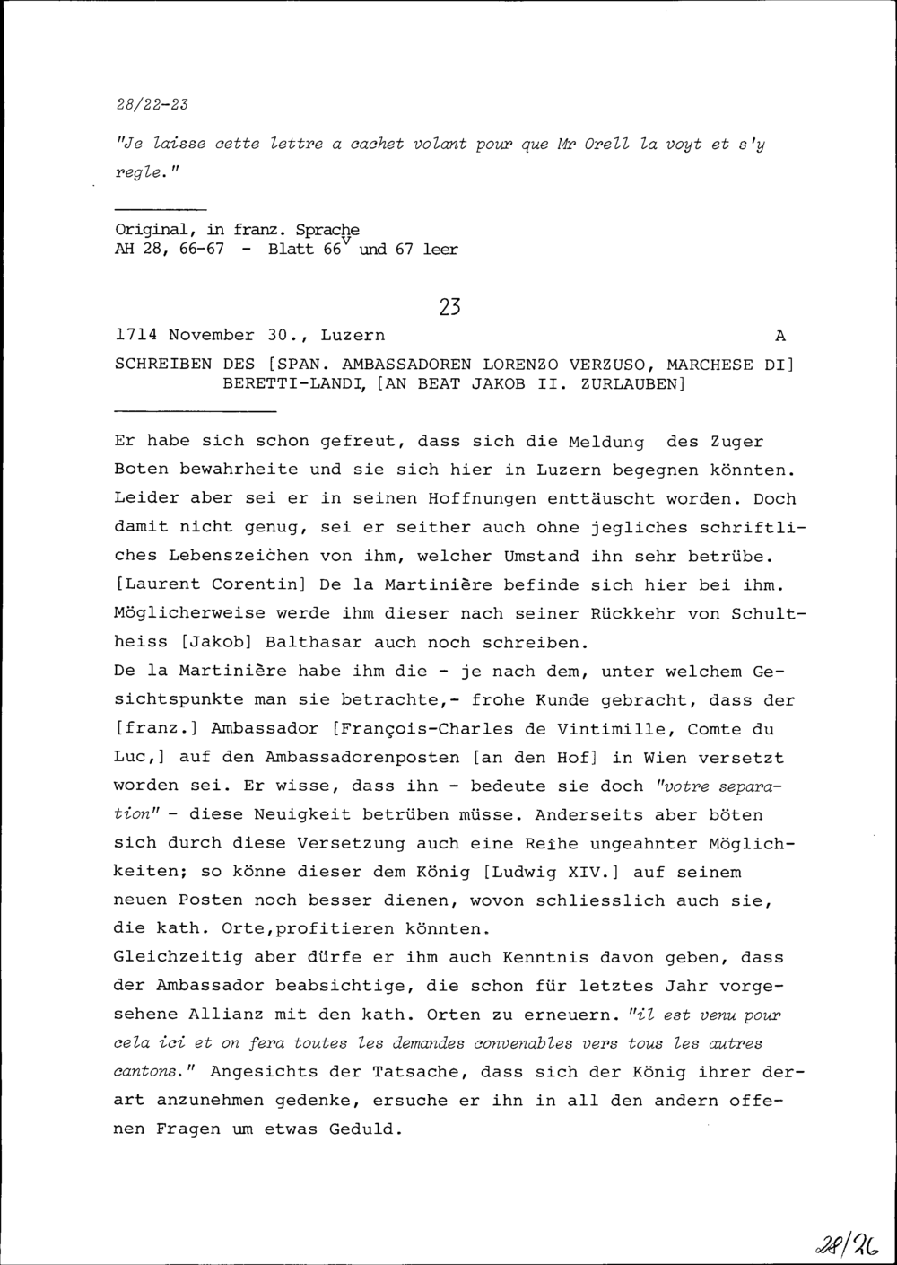 Schreiben von Lorenzo Verzuso, Marchese di Beretti-Landi, Ambassador von Spanien, an Beat Jakob II. Zurlauben