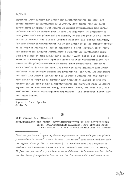 Stellungnahme der französischen Bevollmächtigten zu den Bestrebungen ihrer holländischen Kollegen, mit Spanien möglichst rasch zu einem Vertragsabschluss zu gelangen