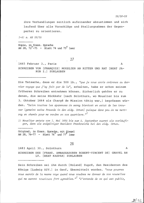 Schreiben von Robert-Vincent de Gravel, Ambassador von Frankreich, an Beat Kaspar Zurlauben, Leutnant
