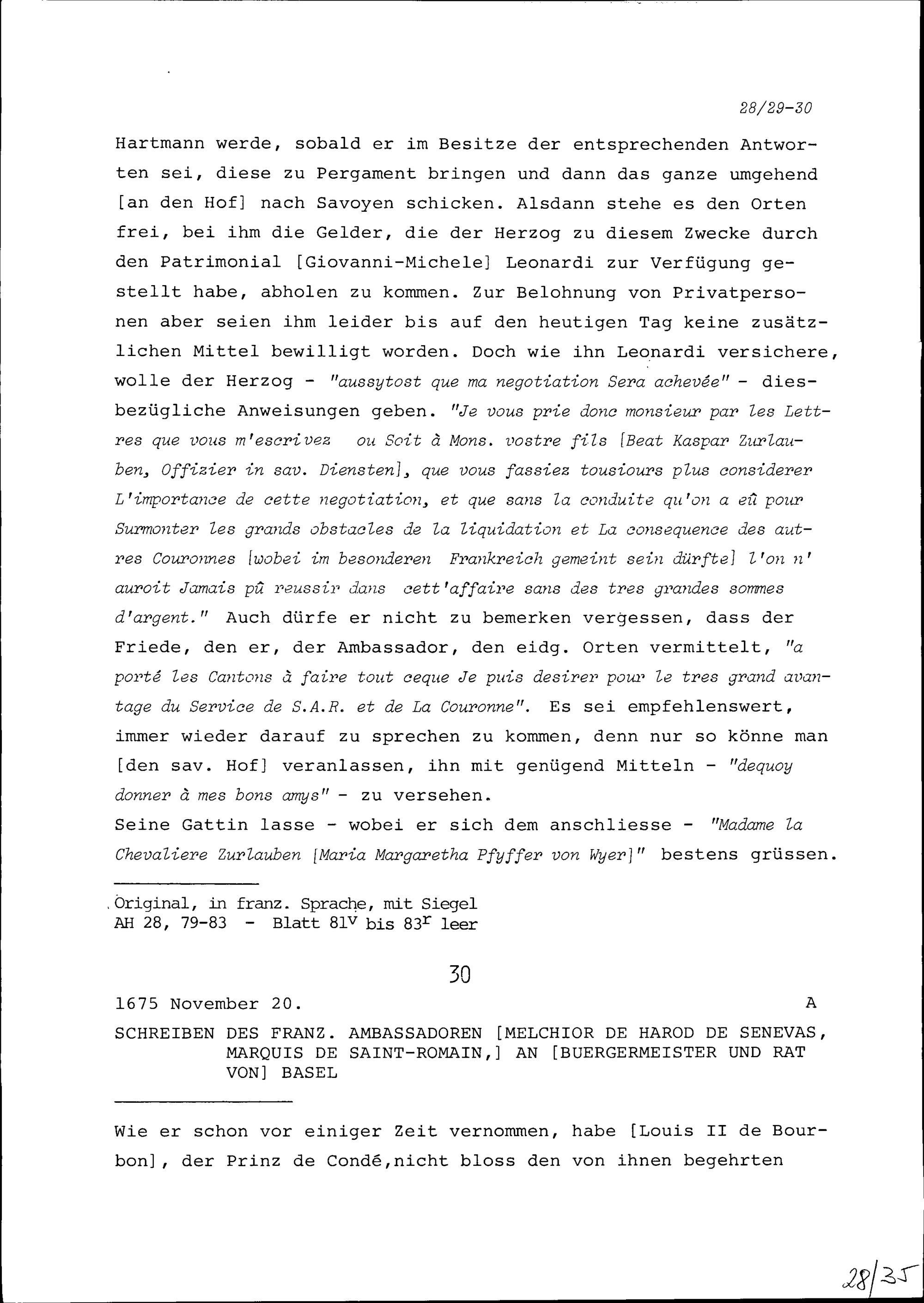Schreiben von Benoît II. Cize, Marquis de Grésy, Ambassador von Savoyen, an Beat...