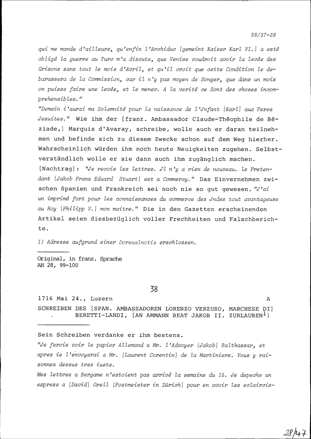 Schreiben von Lorenzo Verzuso, Marchese di Beretti-Landi, Ambassador von Spanien, an Beat Jakob II. Zurlauben, Ammann