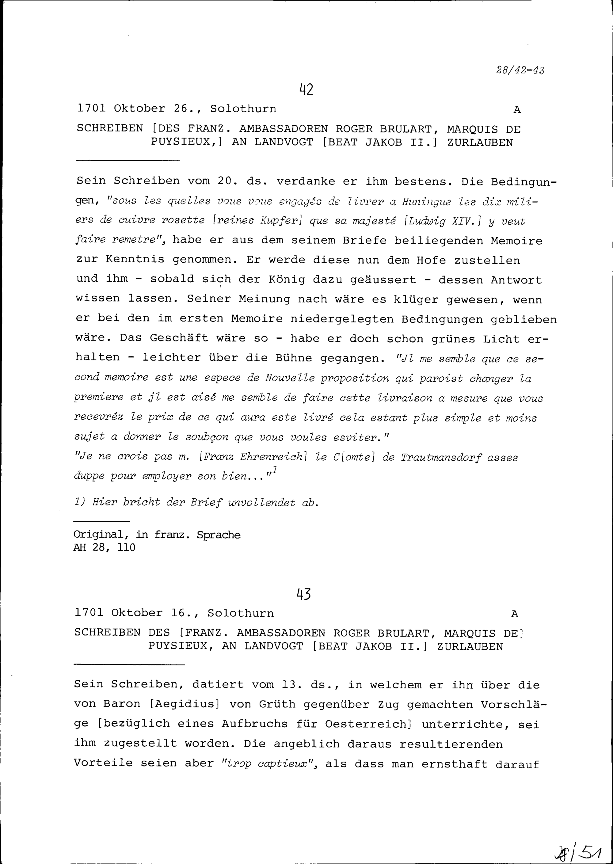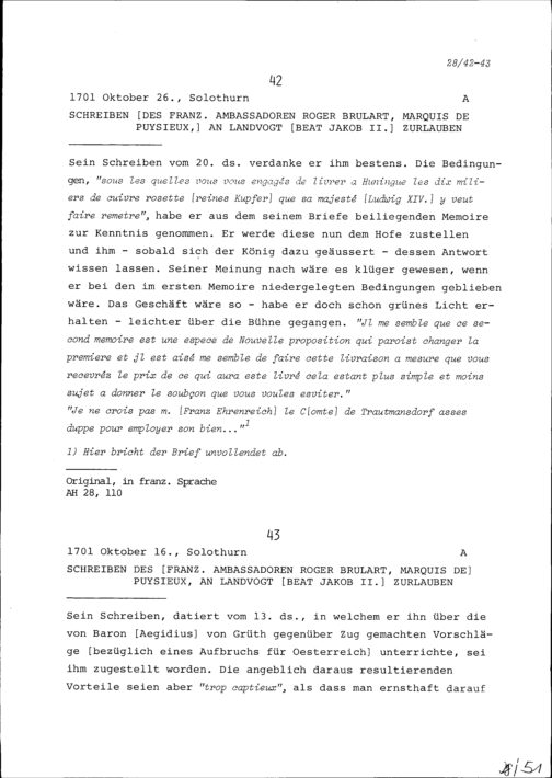 Schreiben von Roger Brûlart, Marquis de Puysieux, Ambassador von Frankreich, an Beat...