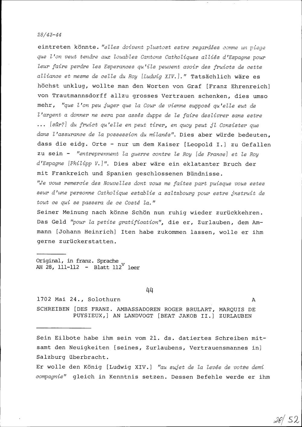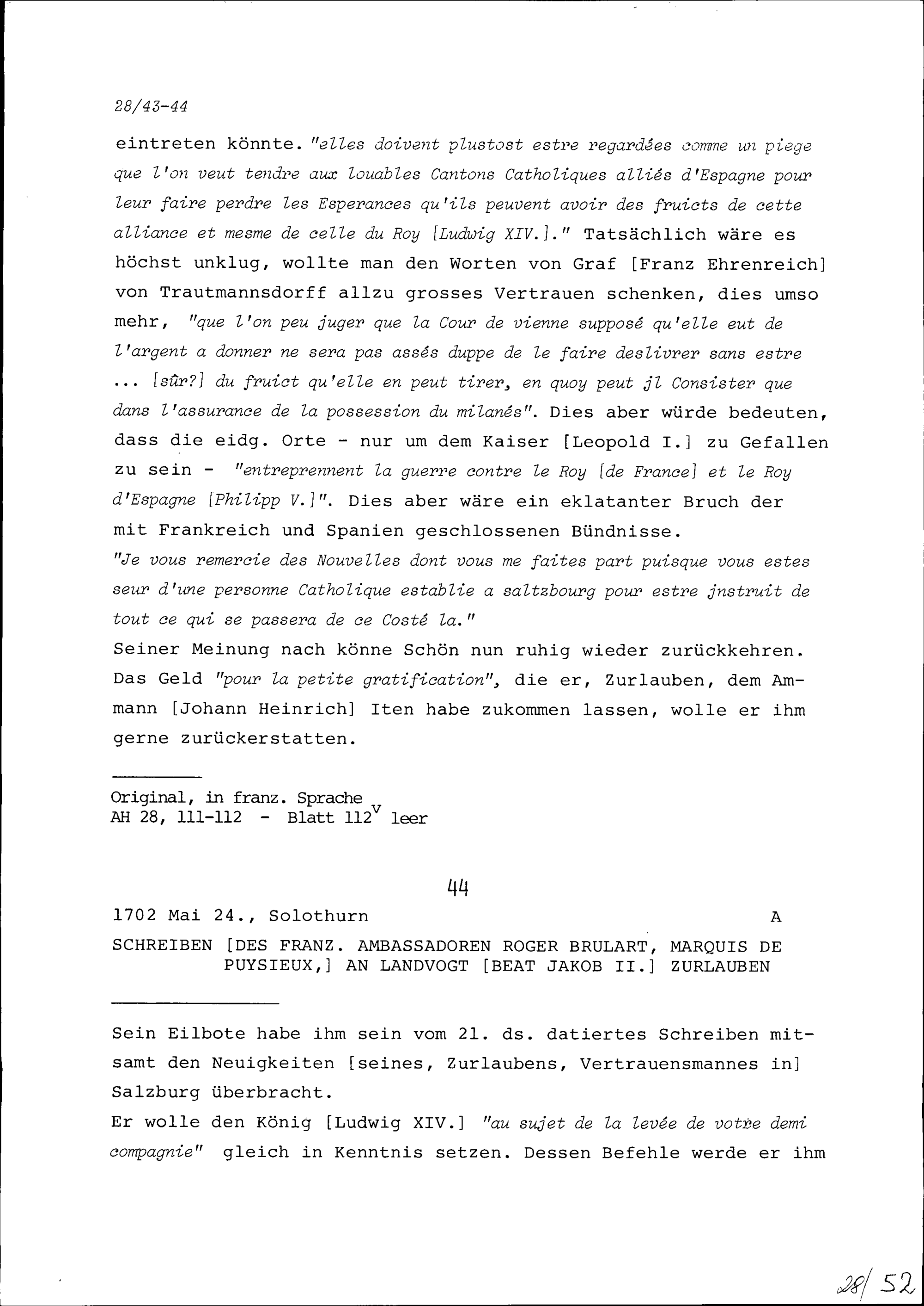Schreiben von Roger Brûlart, Marquis de Puysieux, Ambassador von Frankreich, an Beat...