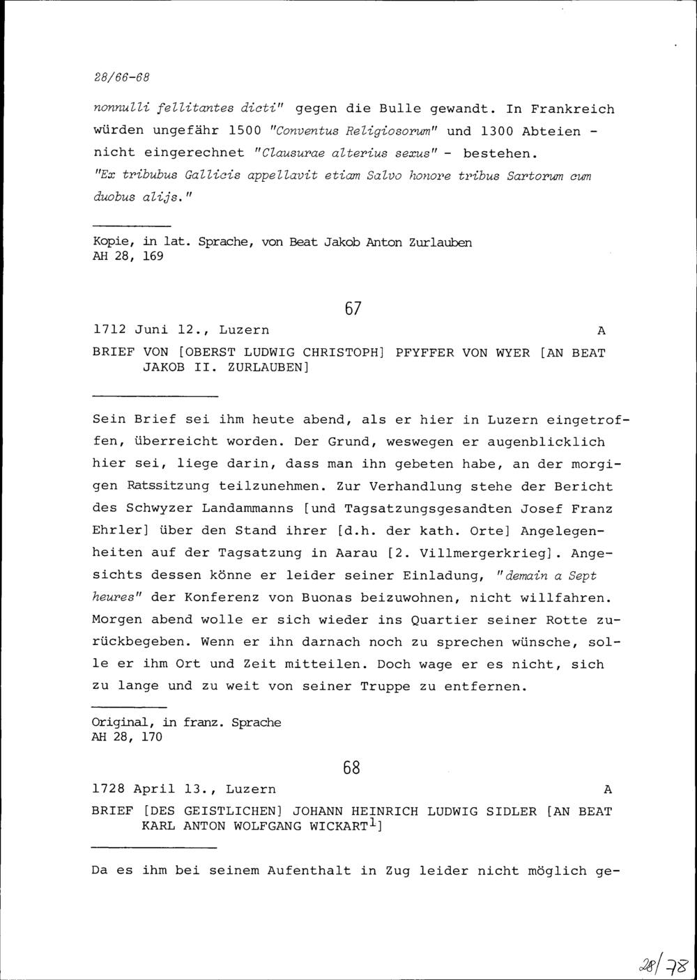 Schreiben von Johann Heinrich Ludwig Sidler, Priester, an Beat Karl Anton Wolfgang...