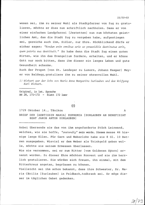 Schreiben von Johann Heinrich Ludwig Sidler, Priester, an Beat Karl Anton Wolfgang Wickart