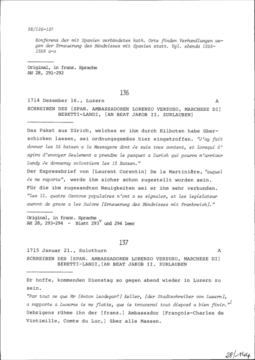 Schreiben von Lorenzo Verzuso, Marchese di Beretti-Landi, Ambassador von Spanien, an Beat Jakob II. Zurlauben, Ammann