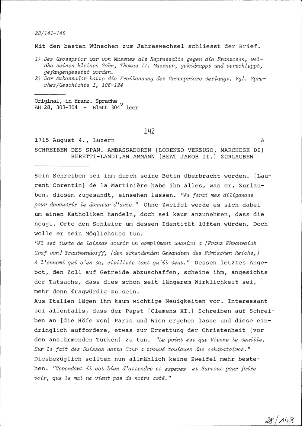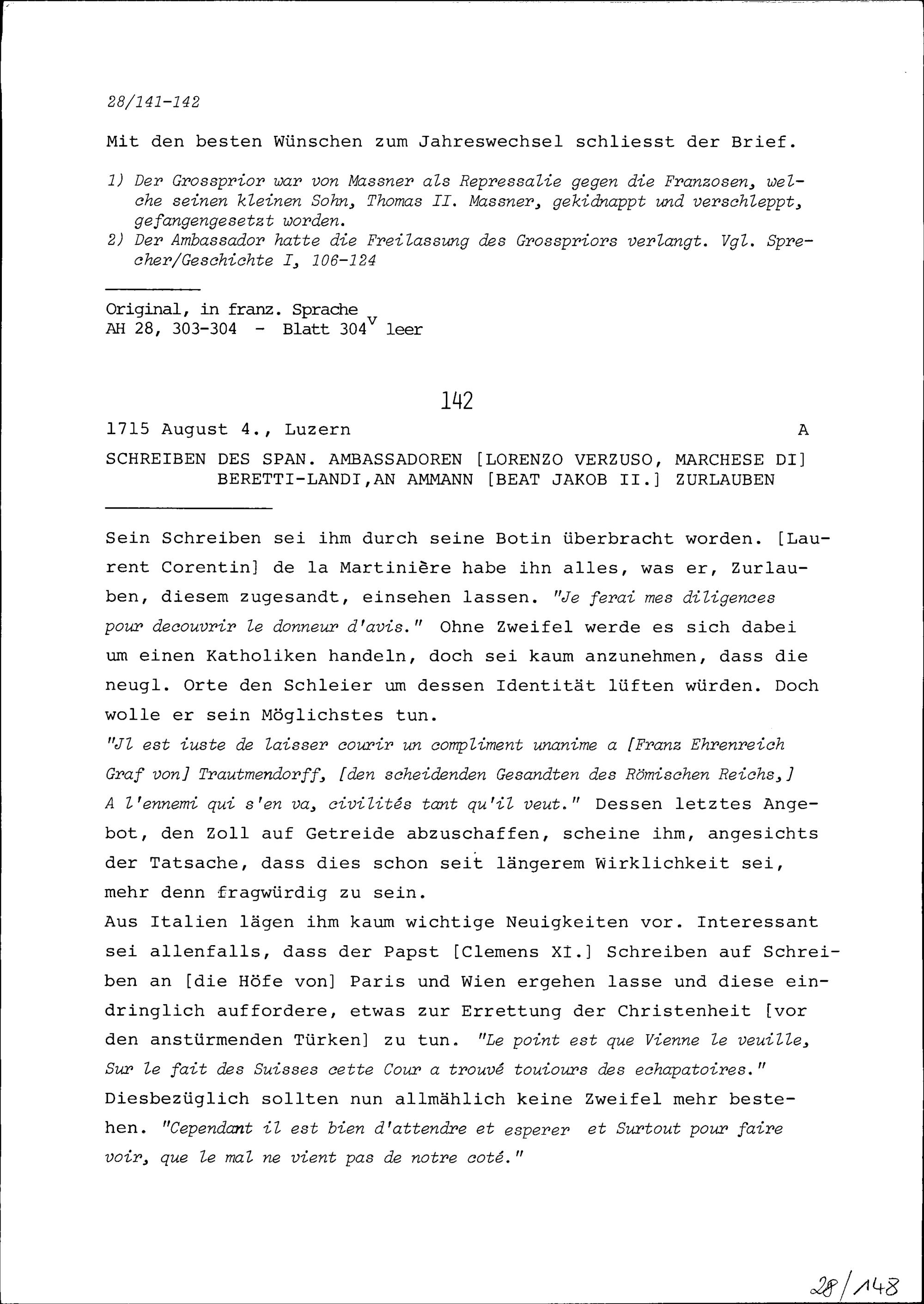 Schreiben von François-Charles de Vintimille, Graf du Luc, Ambassador von Frankreich, an Beat Jakob II. Zurlauben, Ammann