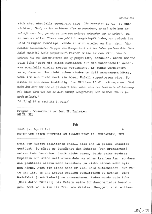 Schreiben von Jakob Füchsli an Beat II. Zurlauben, Ammann