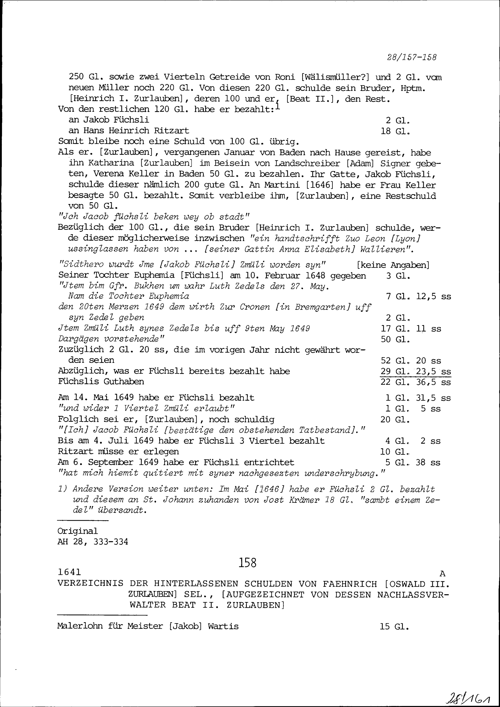 Abrechnung von Beat II. Zurlauben mit Jakob Füchsli und mit Katharina Zurlauben, dessen Gattin, in Zusammenhang mit der Hinterlassenschaft von Oswald III. Zurlauben