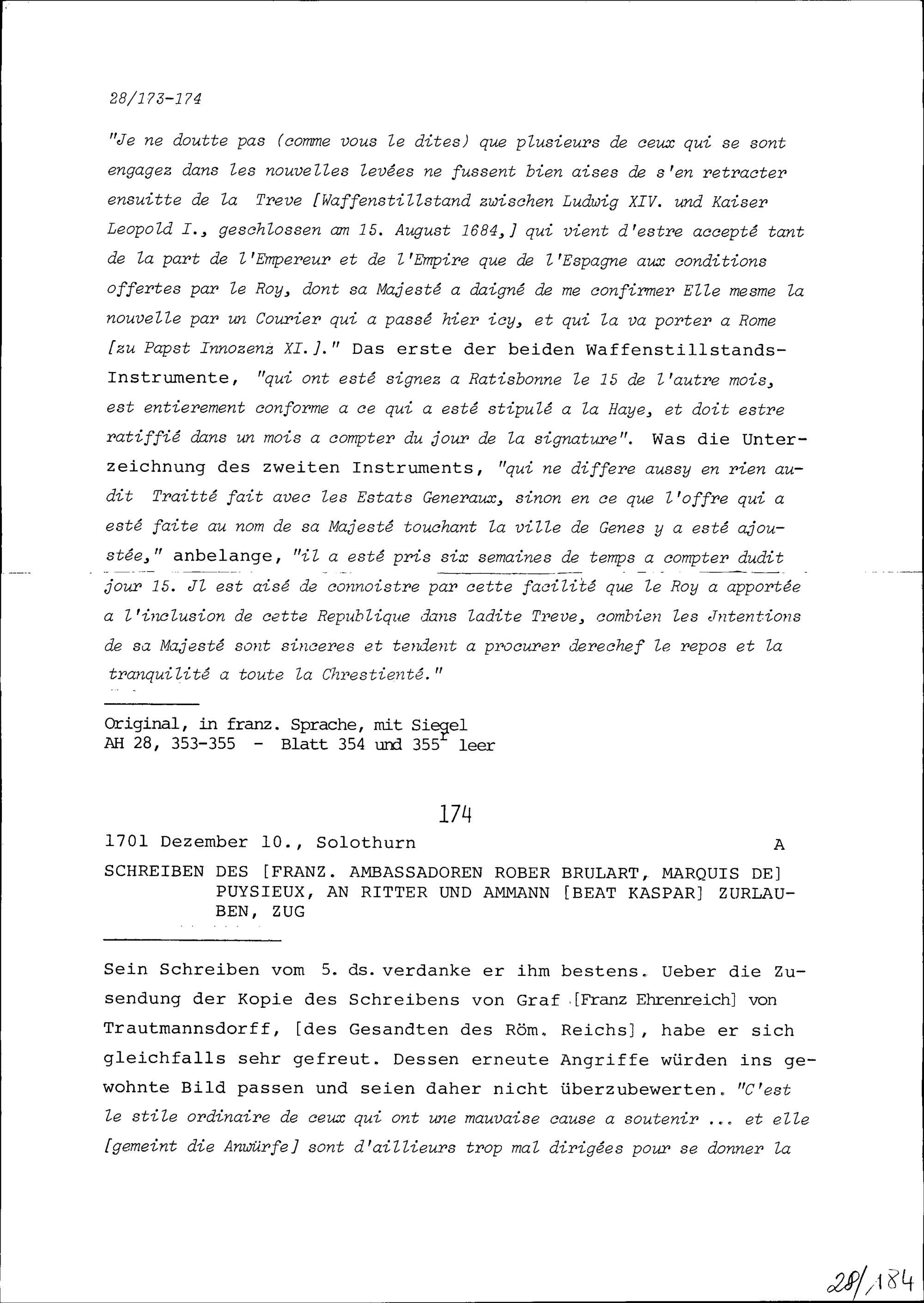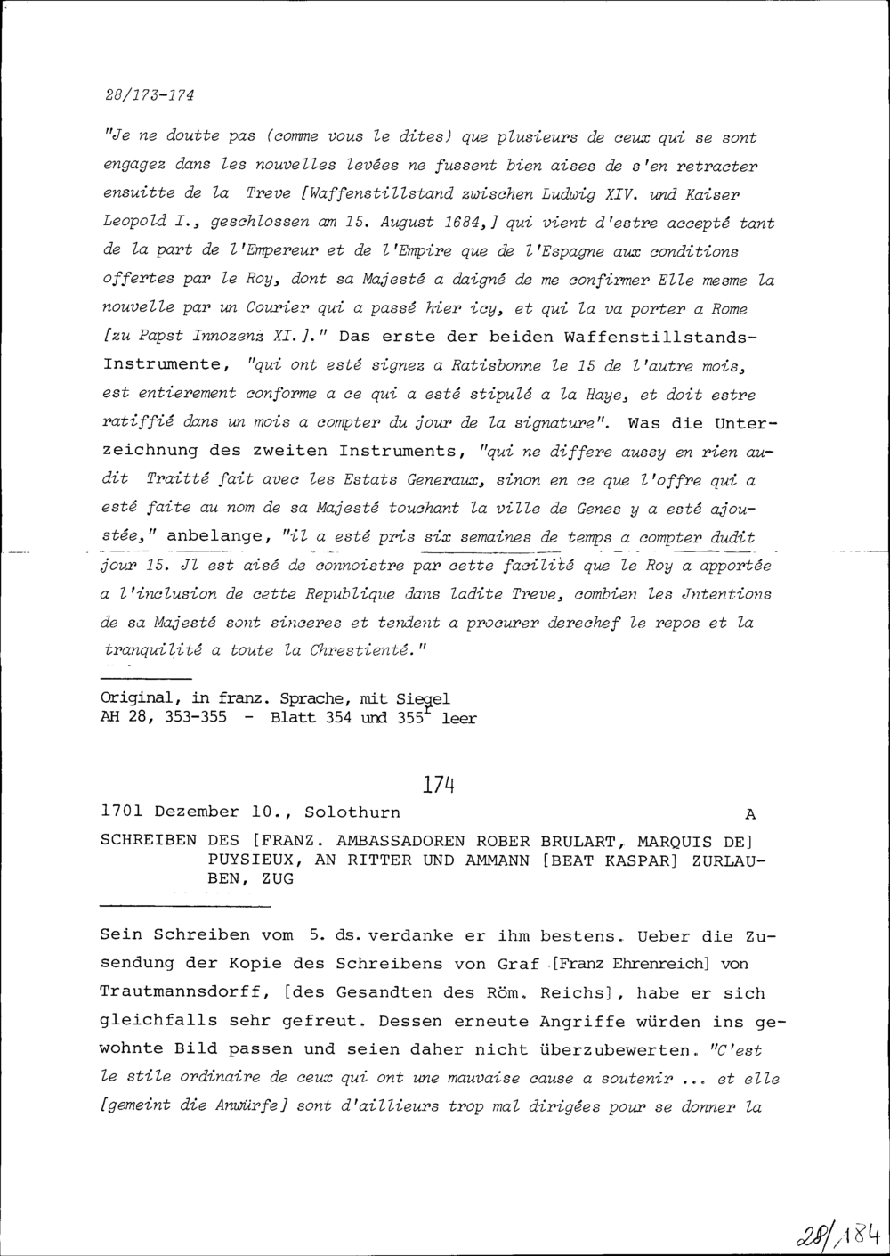 Schreiben von Jules Gravel, Marquis de Marly, ausserordentlicher Ambassador von Frankreich, an Beat Jakob I. Zurlauben, Ammann, Zug