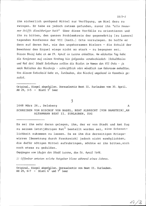 Schreiben von Beat Albrecht von Ramstein, Bischof von Basel, an Beat II. Zurlauben, Altammann und Tagsatzungsgesandter in Luzern