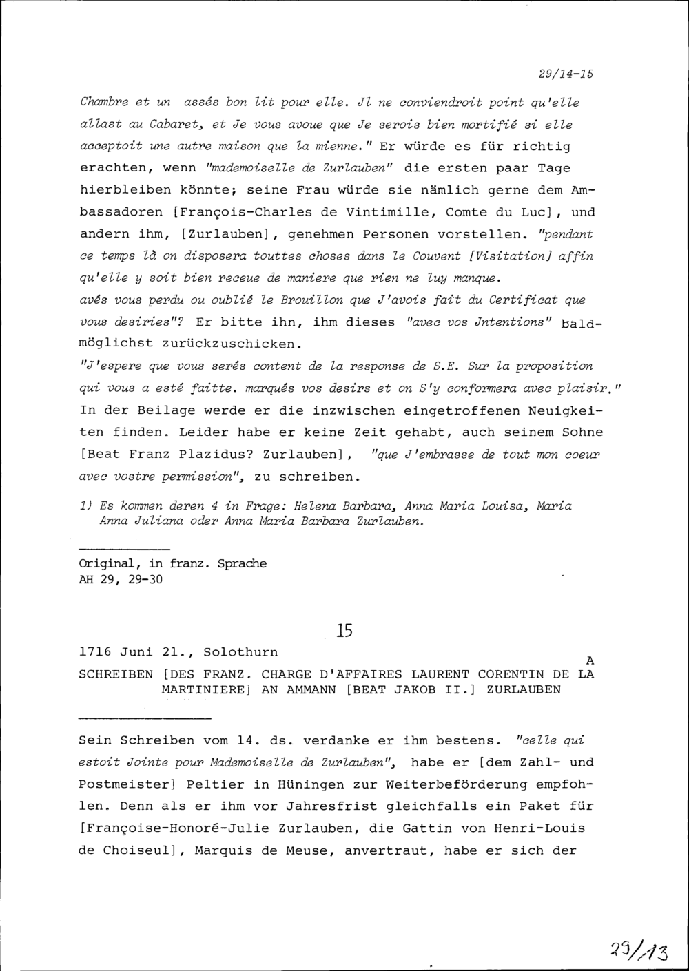 Schreiben von Laurent Corentin de la Martinière, Dolmetscher, an Beat Jakob II. Zurlauben