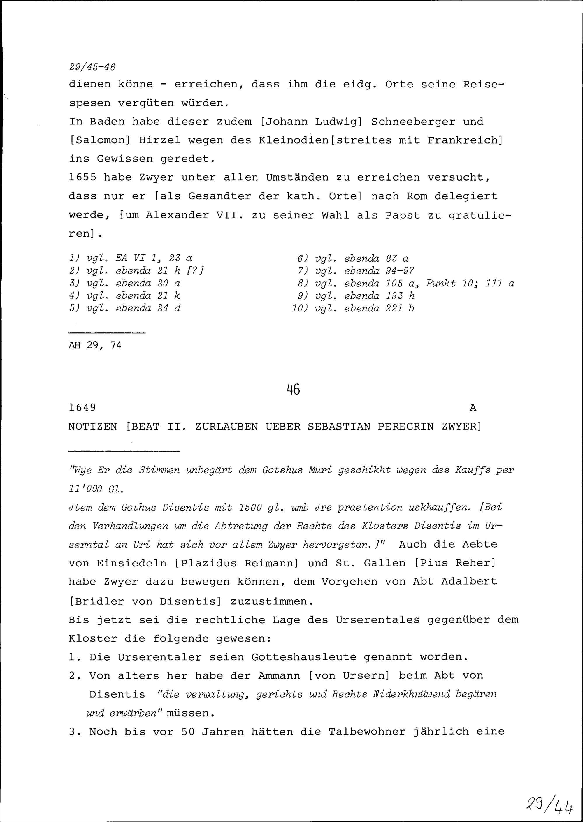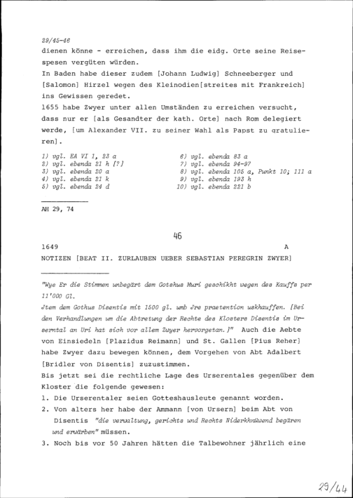 Notiz von Beat II. Zurlauben, Tagsatzungsgesandter, über Sebastian Peregrin Zwye...