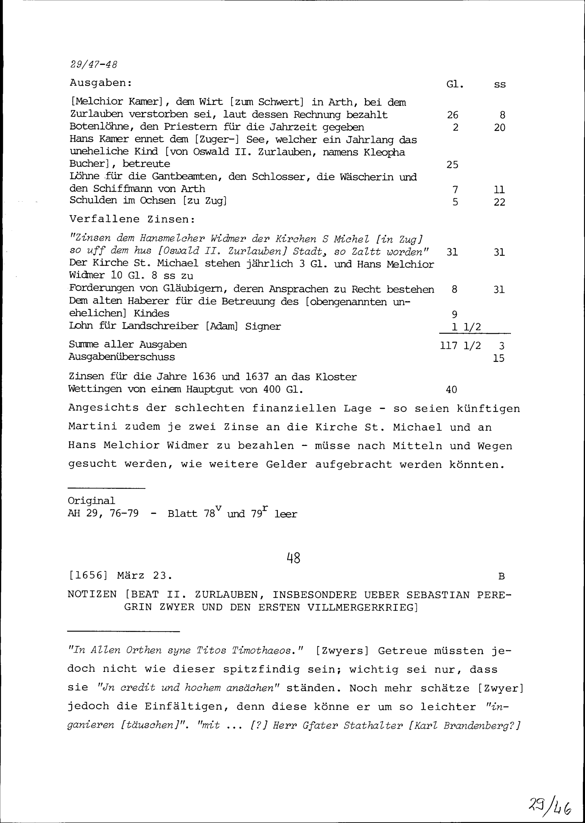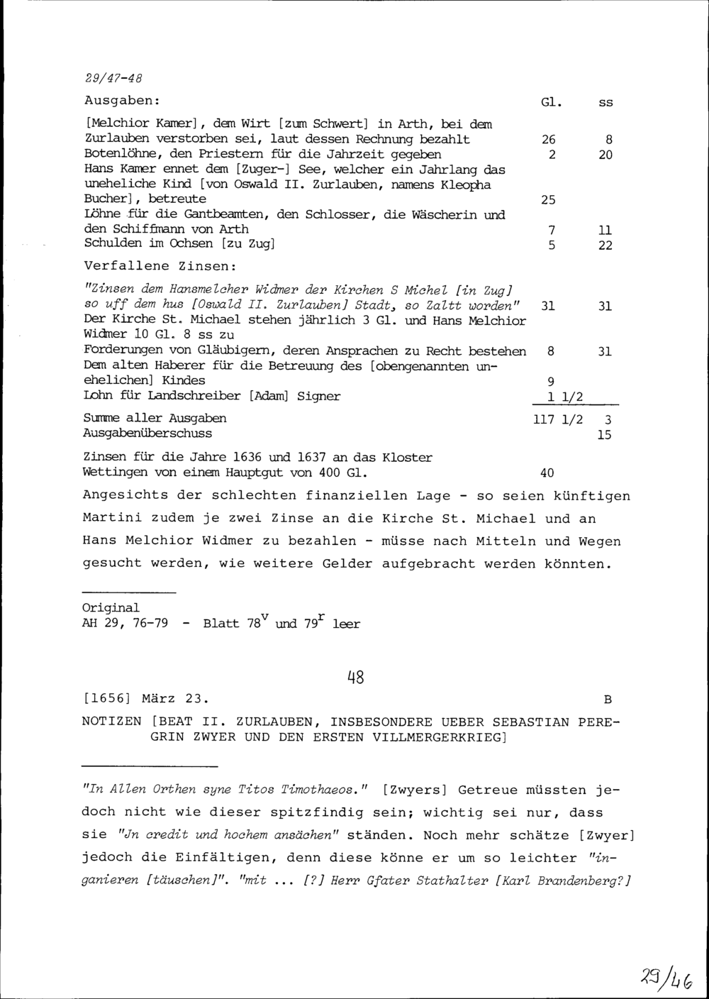 Abrechnung von Adam Signer, Zuger Landschreiber, über die Hinterlassenschaft von Oswald II. Zurlauben, Landvogt