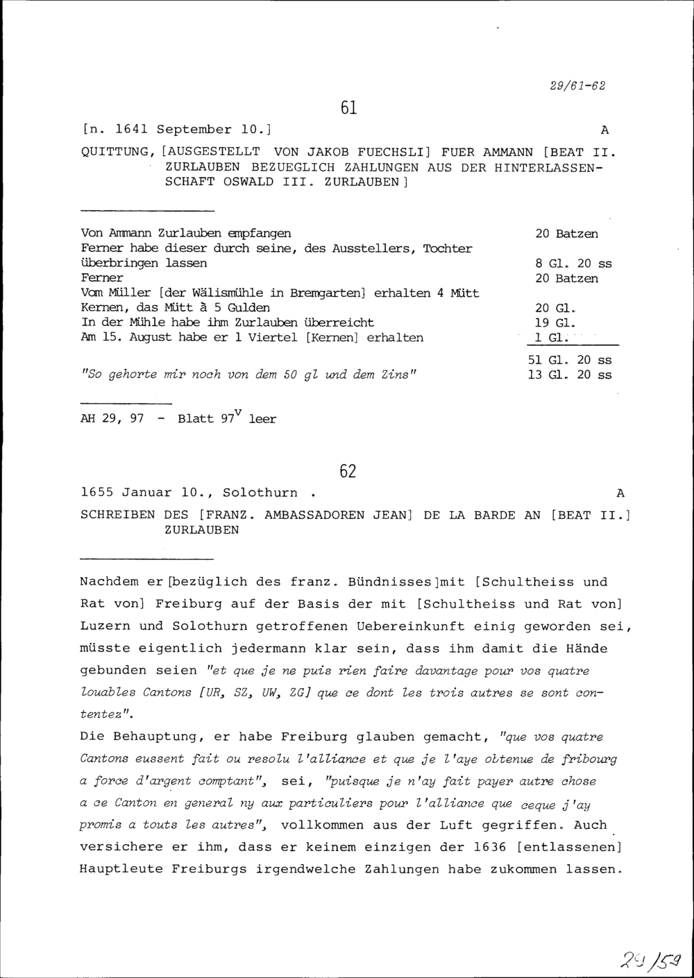 Schreiben von Jean de la Barde, Ambassador von Frankreich, an Beat II. Zurlauben