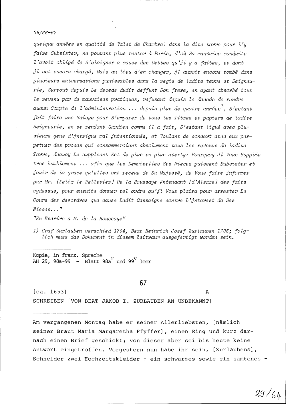 Bittgesuch von Beat Heinrich Josef Zurlauben, Gardehauptmann, an Michel Chamillart zugunsten seiner Nichten Françoise-Honorée-Julie Zurlauben und Anna Theresia Zurlauben
