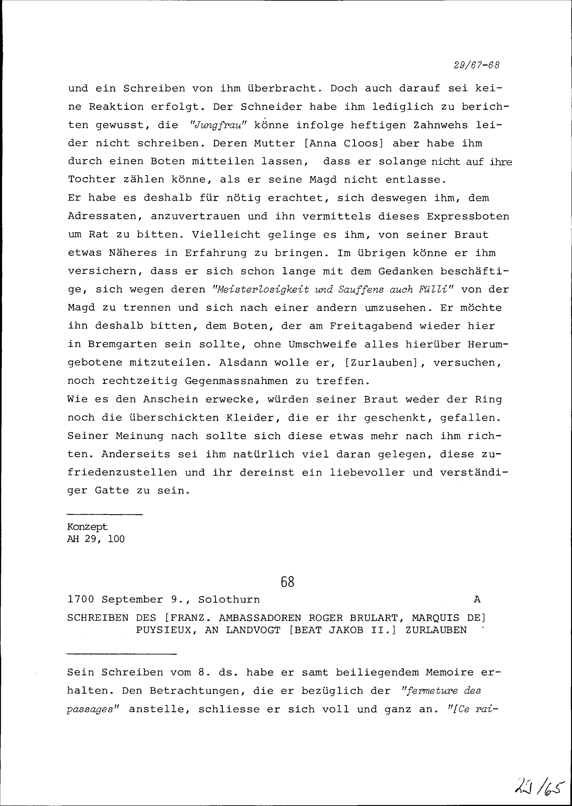 Schreiben von Beat Jakob I. Zurlauben an Unbekannt