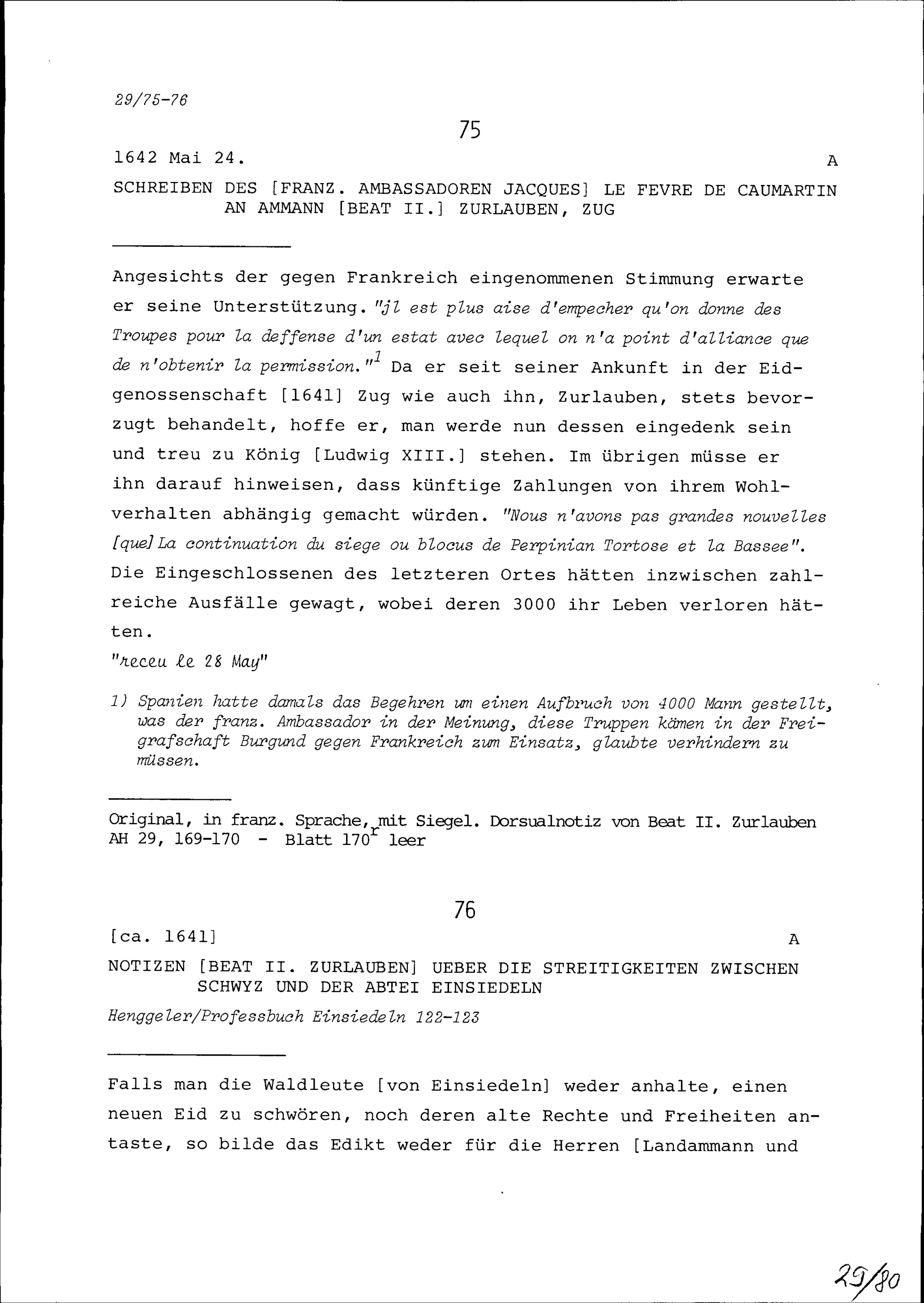 Notiz von Beat II. Zurlauben über die Streitigkeiten zwischen Schwyz und der Abtei Einsiedeln