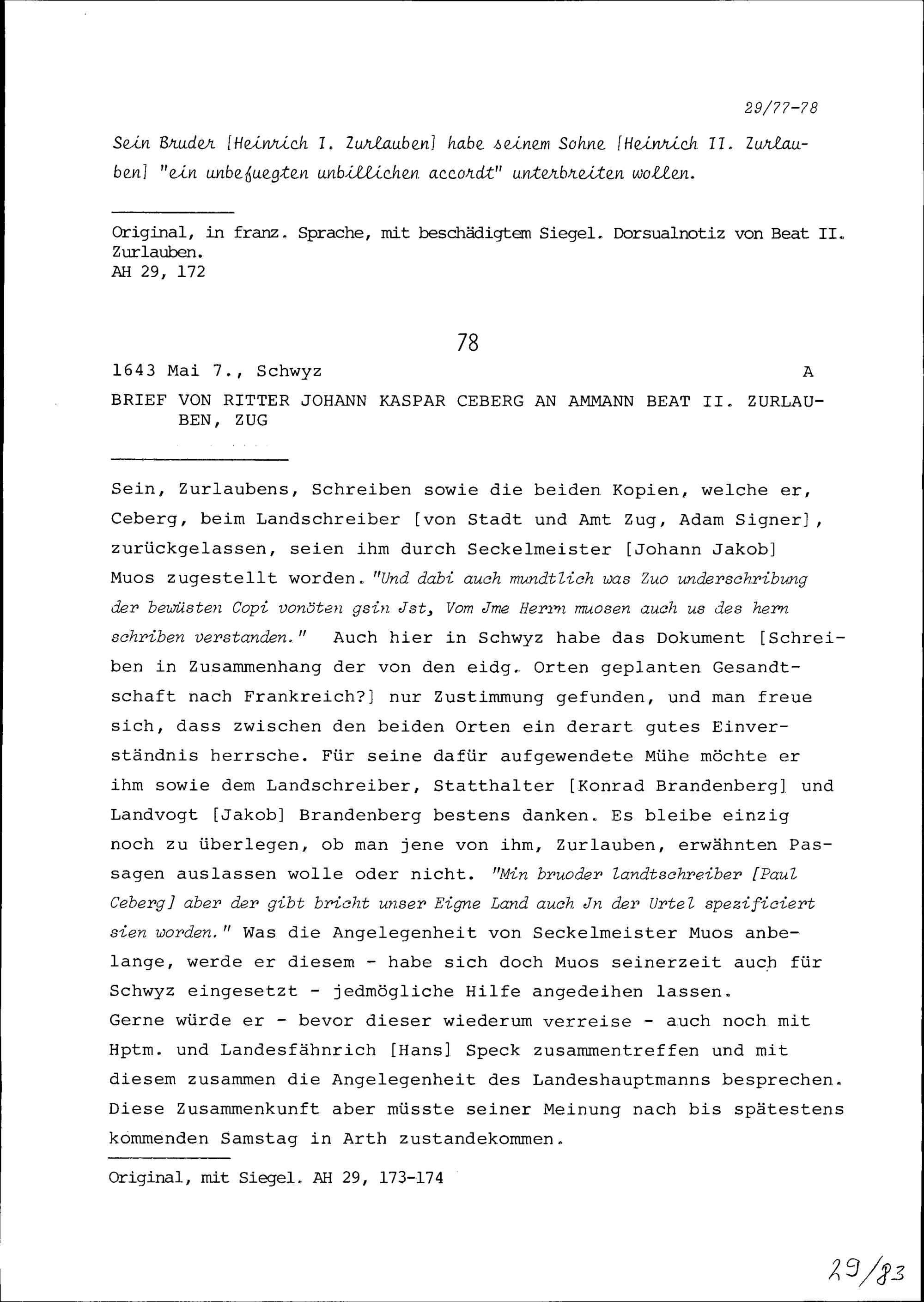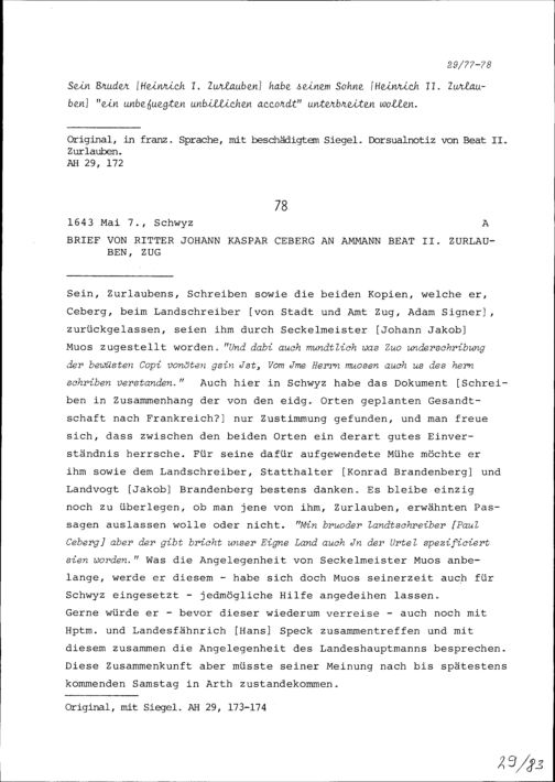Schreiben von Heinrich II. Zurlauben an Beat II. Zurlauben, Ammann, Zug