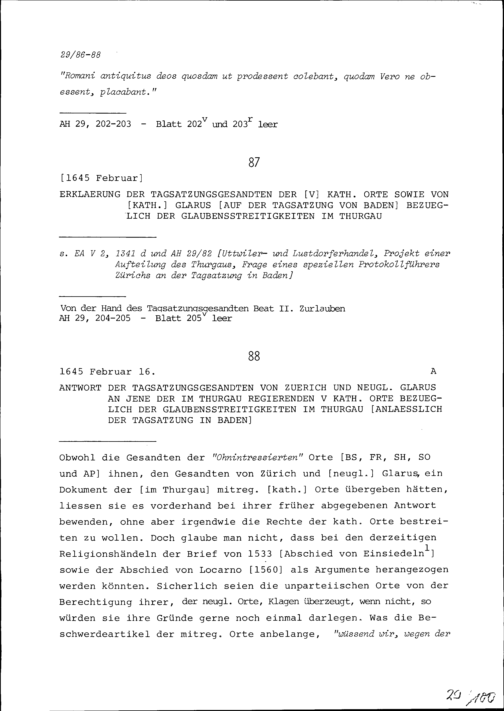 Antwort der Tagsatzungsgesandten von Zürich und Neugläubig Glarus an jene der im Thurgau regierenden Fünf Katholischen Orte bezüglich der Glaubensstreitigkeiten im Thurgau anlässlich der Tagsatzung in Baden