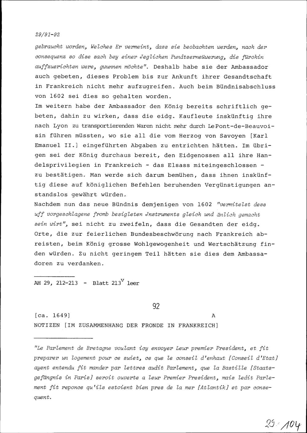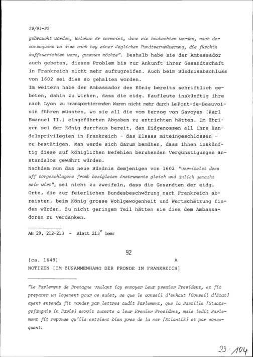 Bericht über die Bemühungen von Jean de la Barde, Ambassador von Frankreich, in Zusammenhang mit der Erneuerung des französischen Bündnisses