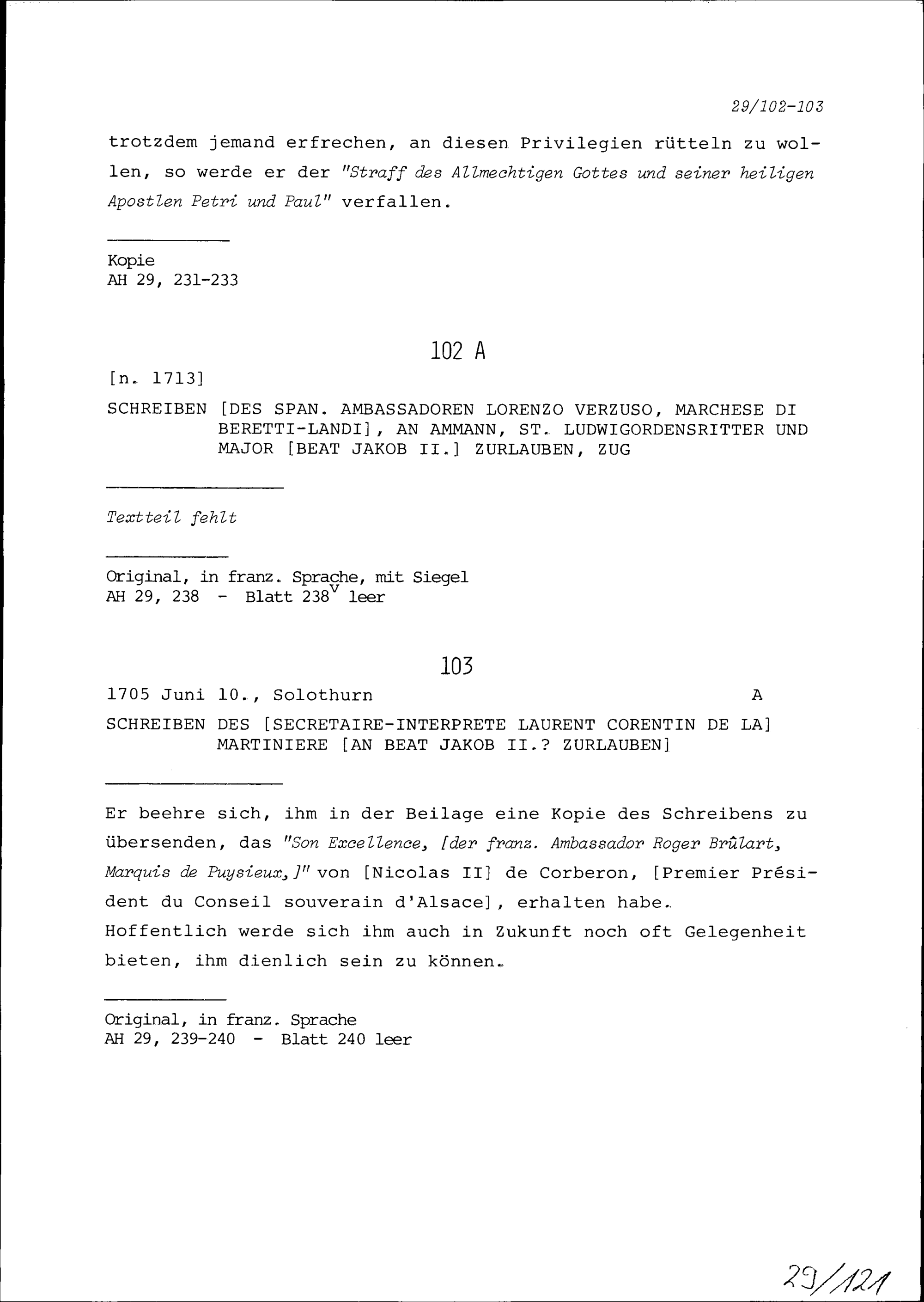 Schreiben von Laurent Corentin de la Martinière, Dolmetscher, an Beat Jakob II. Zurlauben