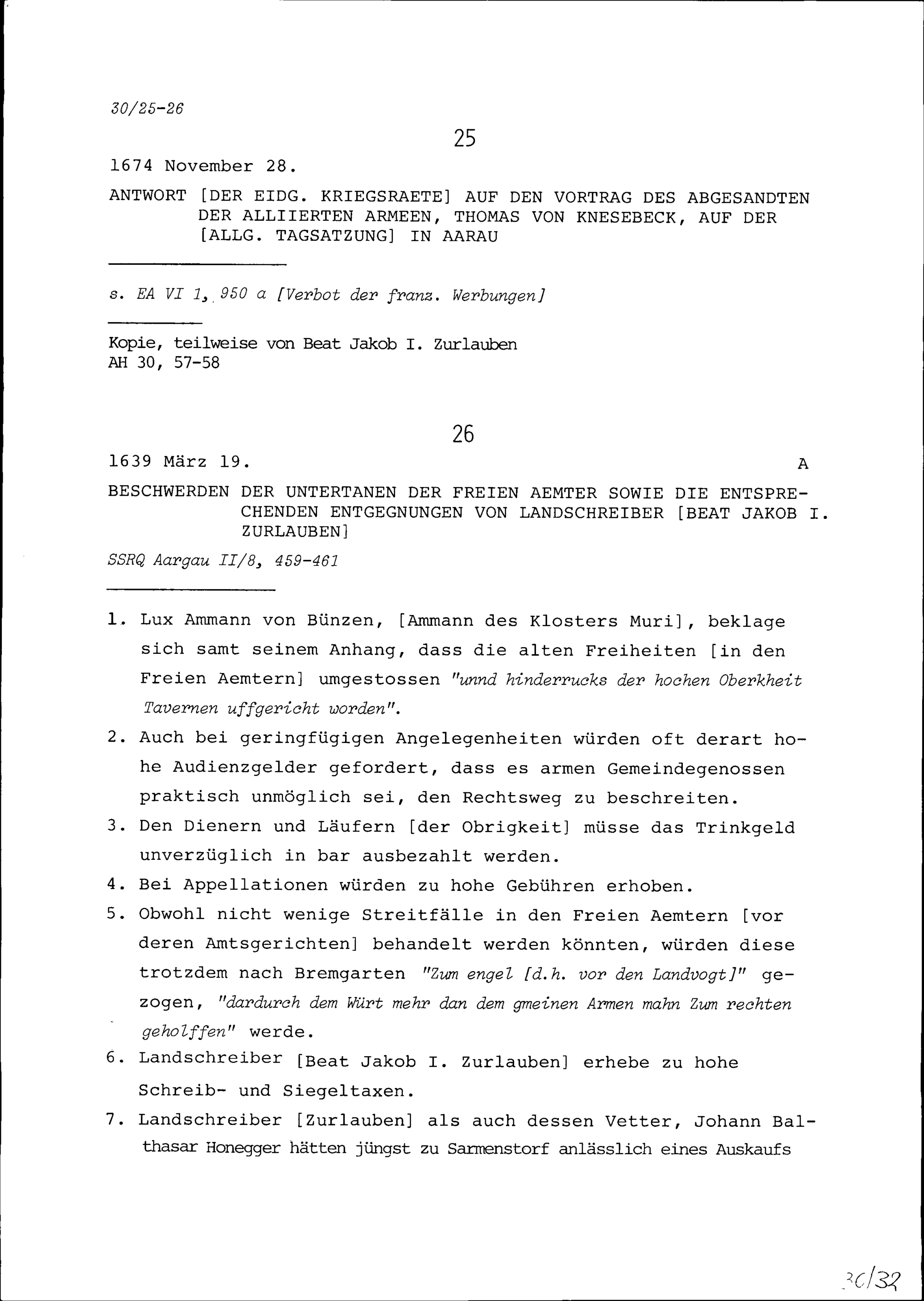 Beschwerden der Untertanen der Freien Ämter sowie die entsprechenden Entgegnungen von Beat Jakob I. Zurlauben, Landschreiber