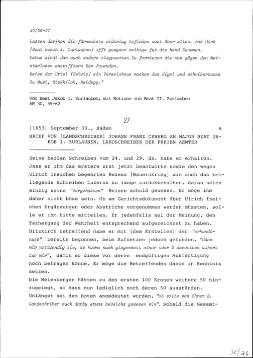 Beschwerden der Untertanen der Freien Ämter sowie die entsprechenden Entgegnungen von Beat Jakob I. Zurlauben, Landschreiber