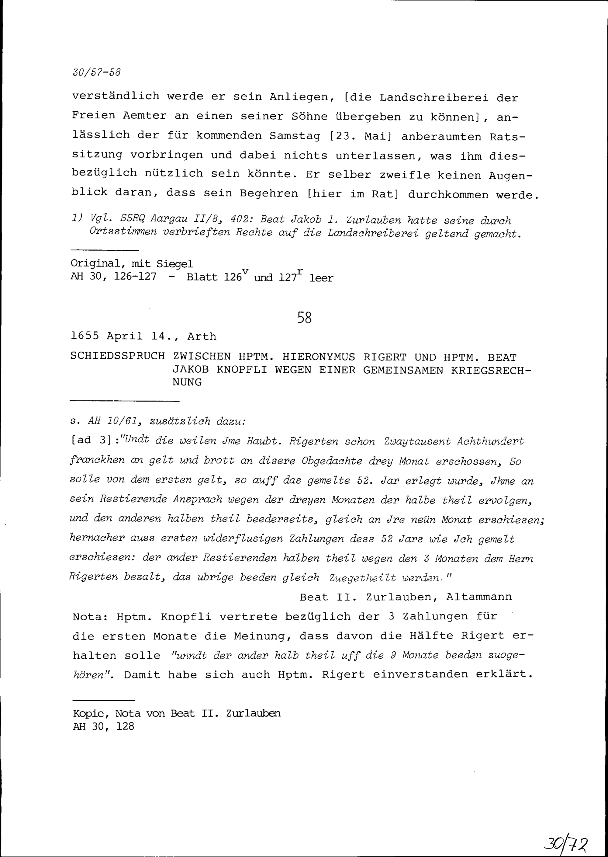 Schreiben von Johann Melchior von Atzigen, Landammann, an Beat Jakob I. Zurlauben, Statthalter und Landeshauptmann, Zug