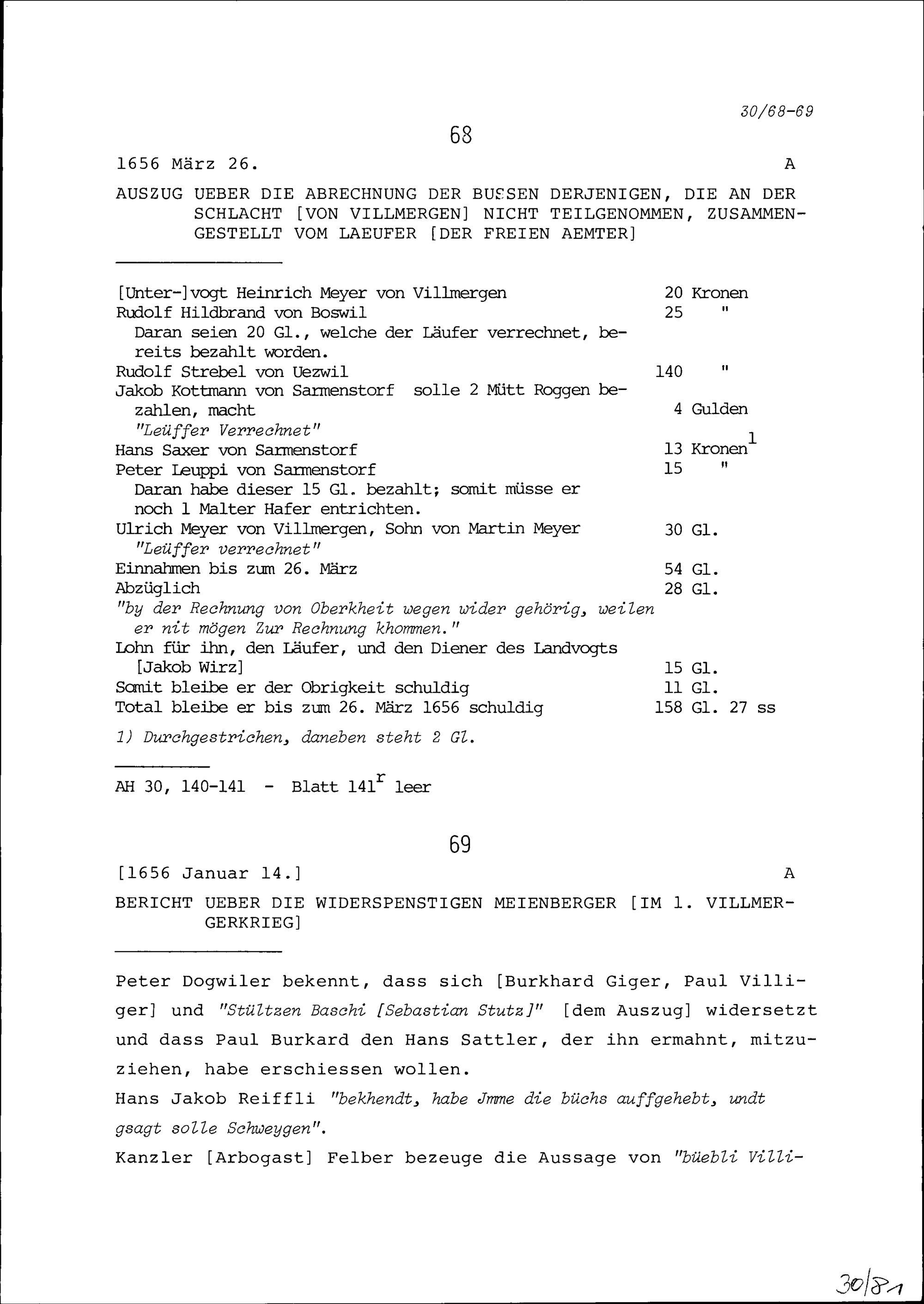 Bericht über die widerspenstigen Meienberger im Ersten Villmergerkrieg