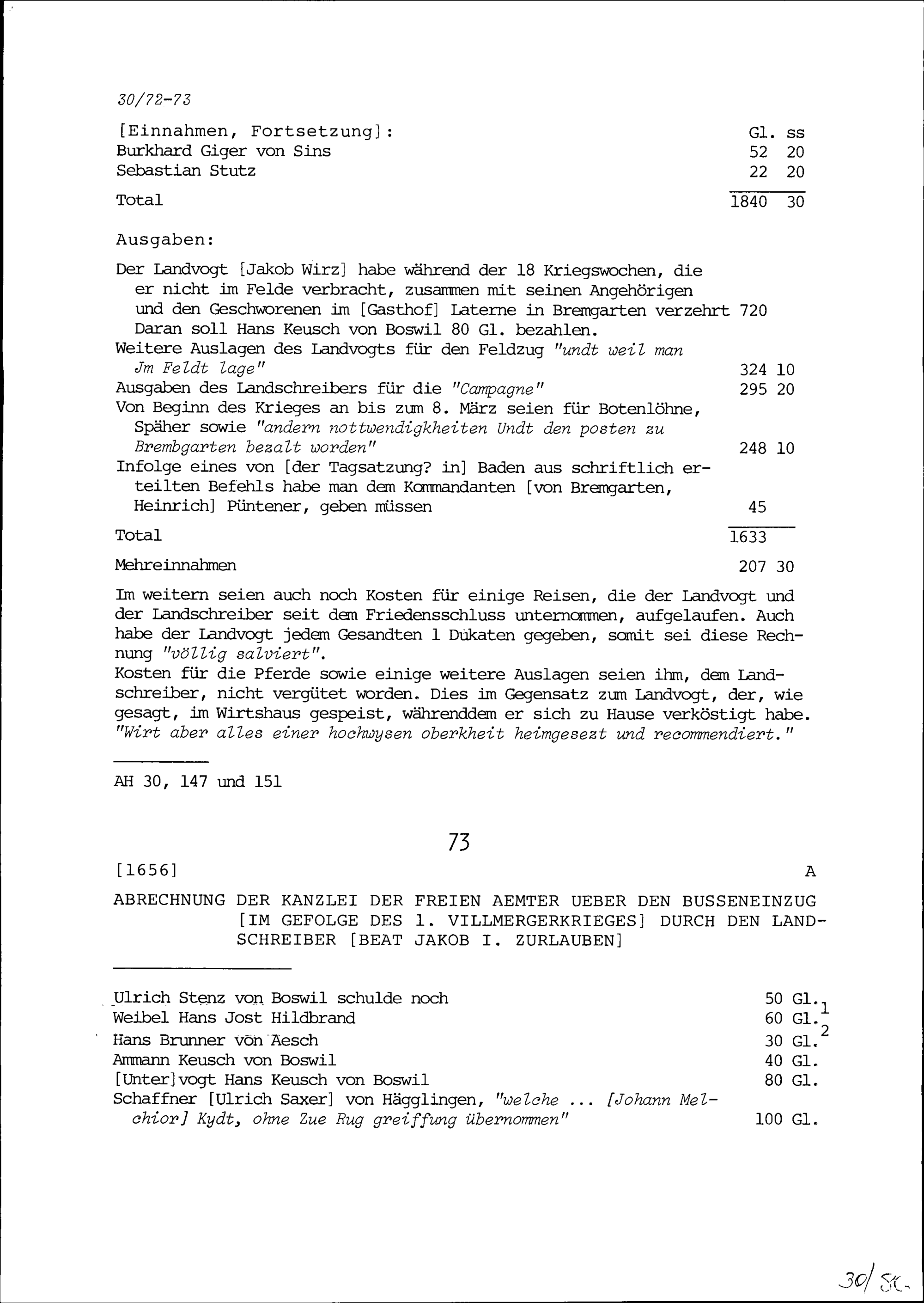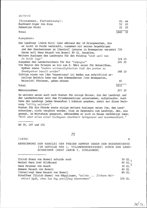 Abrechnung von Beat Jakob I. Zurlauben über Einnahmen und Ausgaben in Zusammenhang mit dem Busseneinzug bei den widerspenstigen Freien Ämter im Ersten Villmergerkrieg