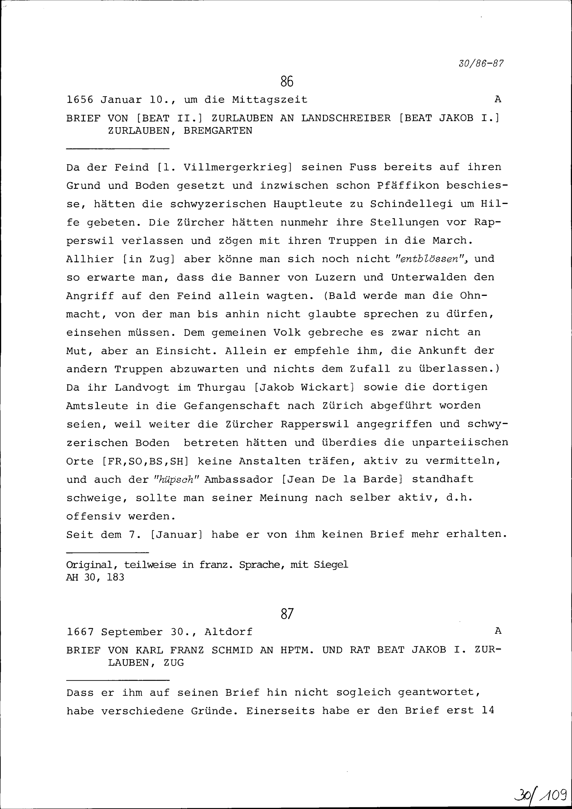 Schreiben von Karl Franz Schmid an Beat Jakob I. Zurlauben, Hauptmann und Rat, Zug
