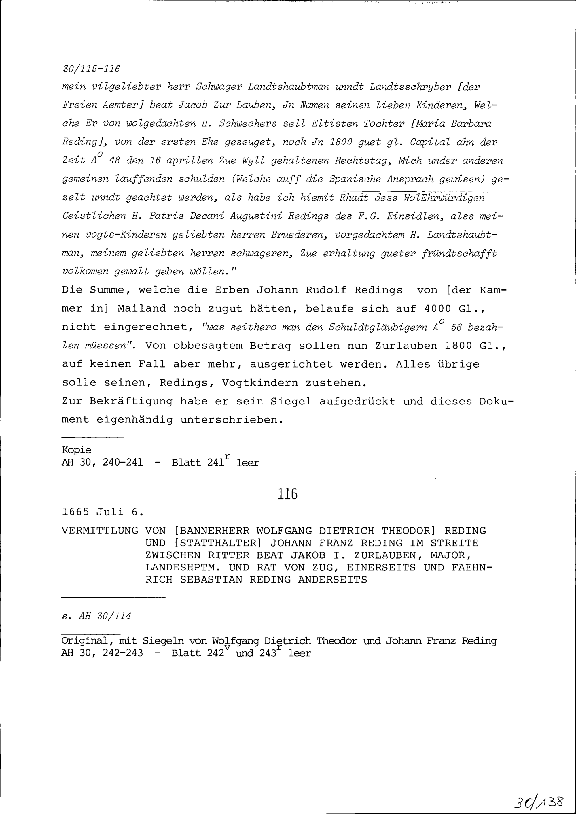 Erklärung von Sebastian Reding im Streit zwischen ihm und Beat Jakob I. Zurlauben