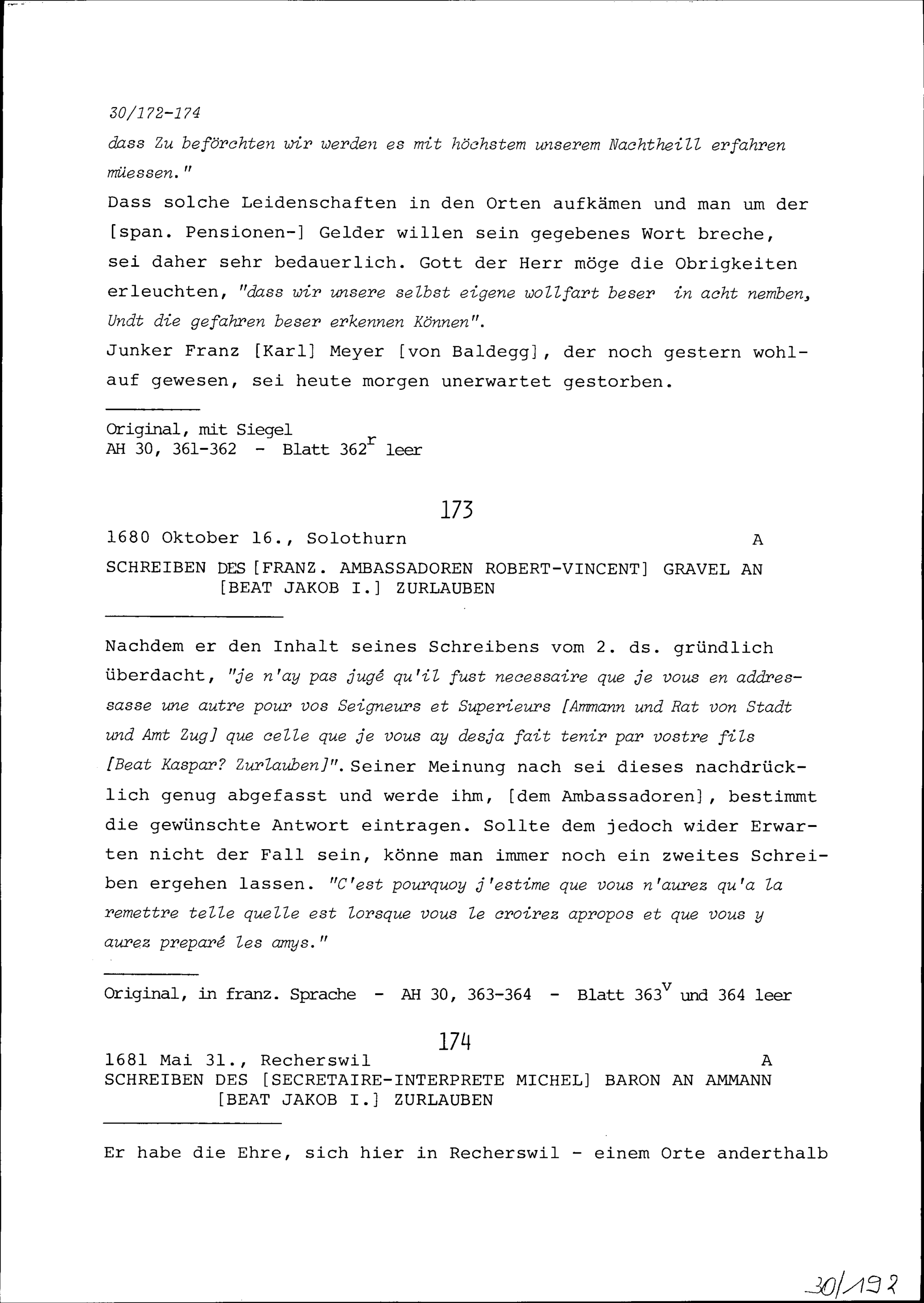 Schreiben von Rudolf Mohr an Beat Jakob I. Zurlauben, Ammann, Major, Zug