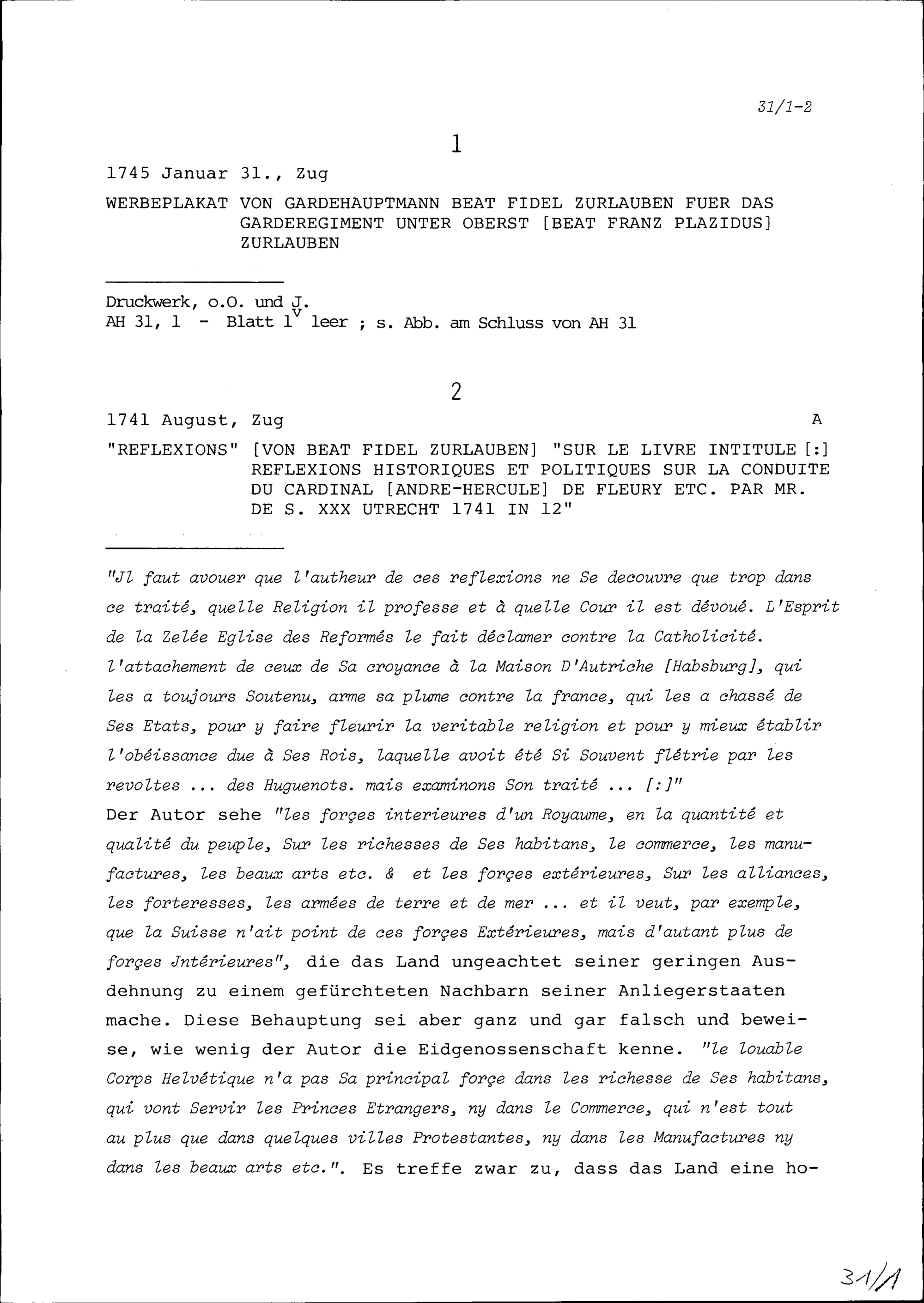 Anmerkungen von Beat Fidel Zurlauben zum Buch Reflexions historiques et politiques sur la conduite du Cardinal de Fleuri, premier-ministre de France, dans la conjoncture presente des affaires de l'Europe, Utrecht, 1741