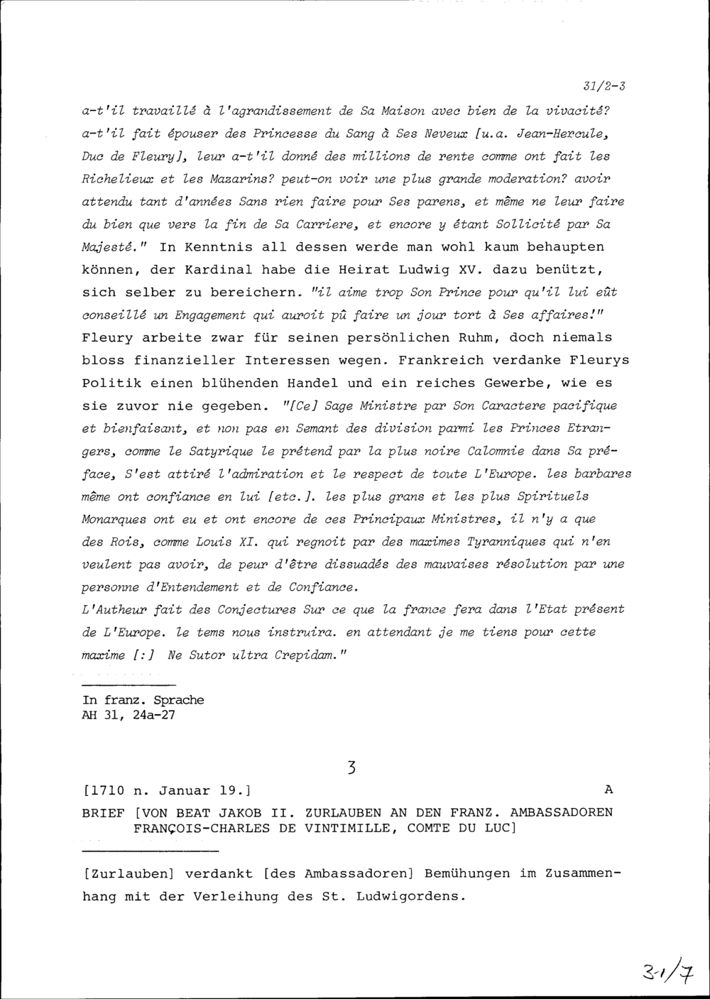 Anmerkungen von Beat Fidel Zurlauben zum Buch Reflexions historiques et politiques sur la conduite du Cardinal de Fleuri, premier-ministre de France, dans la conjoncture presente des affaires de l'Europe, Utrecht, 1741