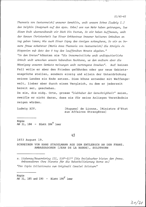 Schreiben von Ludwig XIV., König von Frankreich, an die Dreizehn Orte sowie den Abt...