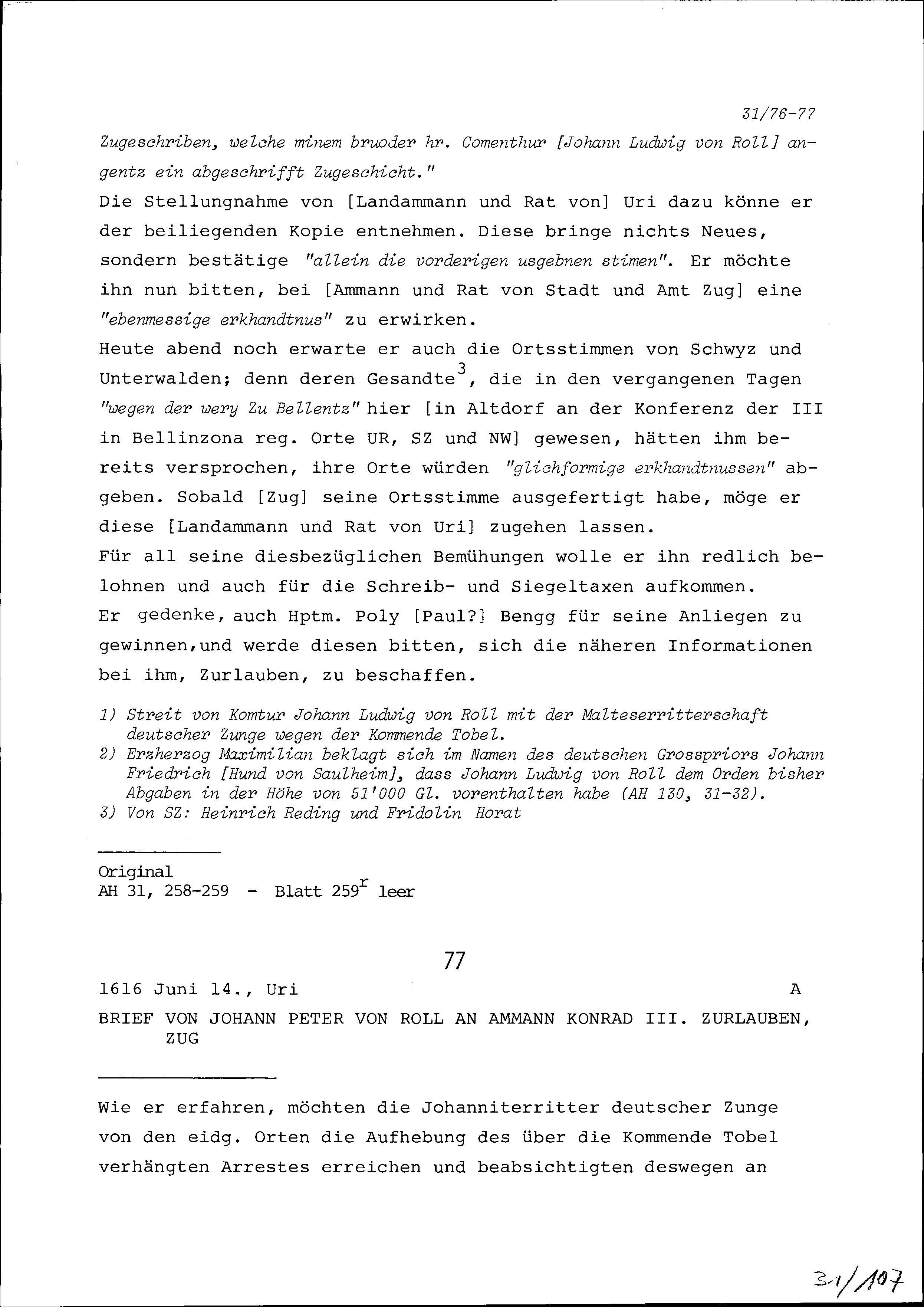 Schreiben von Johann Peter von Roll an Konrad III. Zurlauben, Ammann