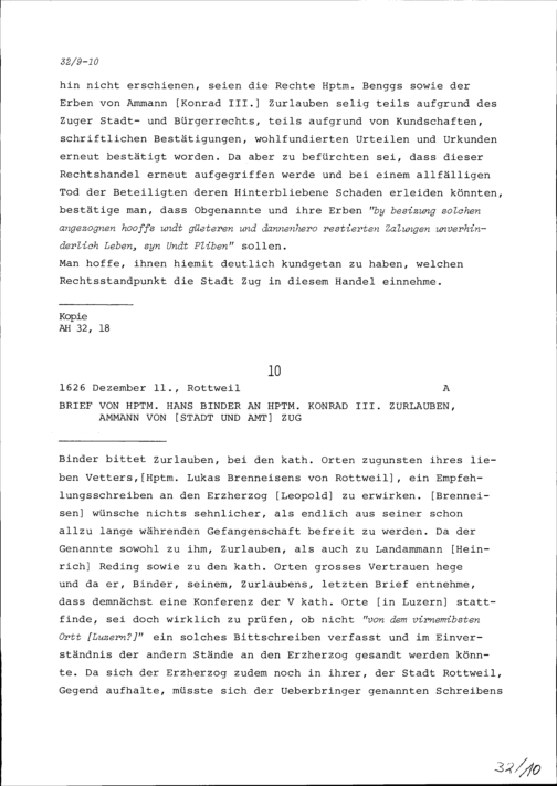 Schreiben des Stabführers und Rats der Stadt Zug an Landesfähnrich und Zweifachen...