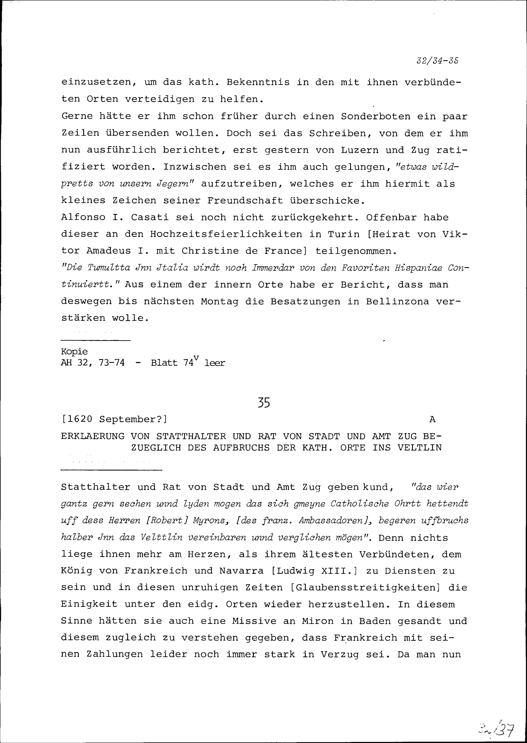 Schreiben von Konrad III. Zurlauben an Robert Miron, Ambassador von Frankreich