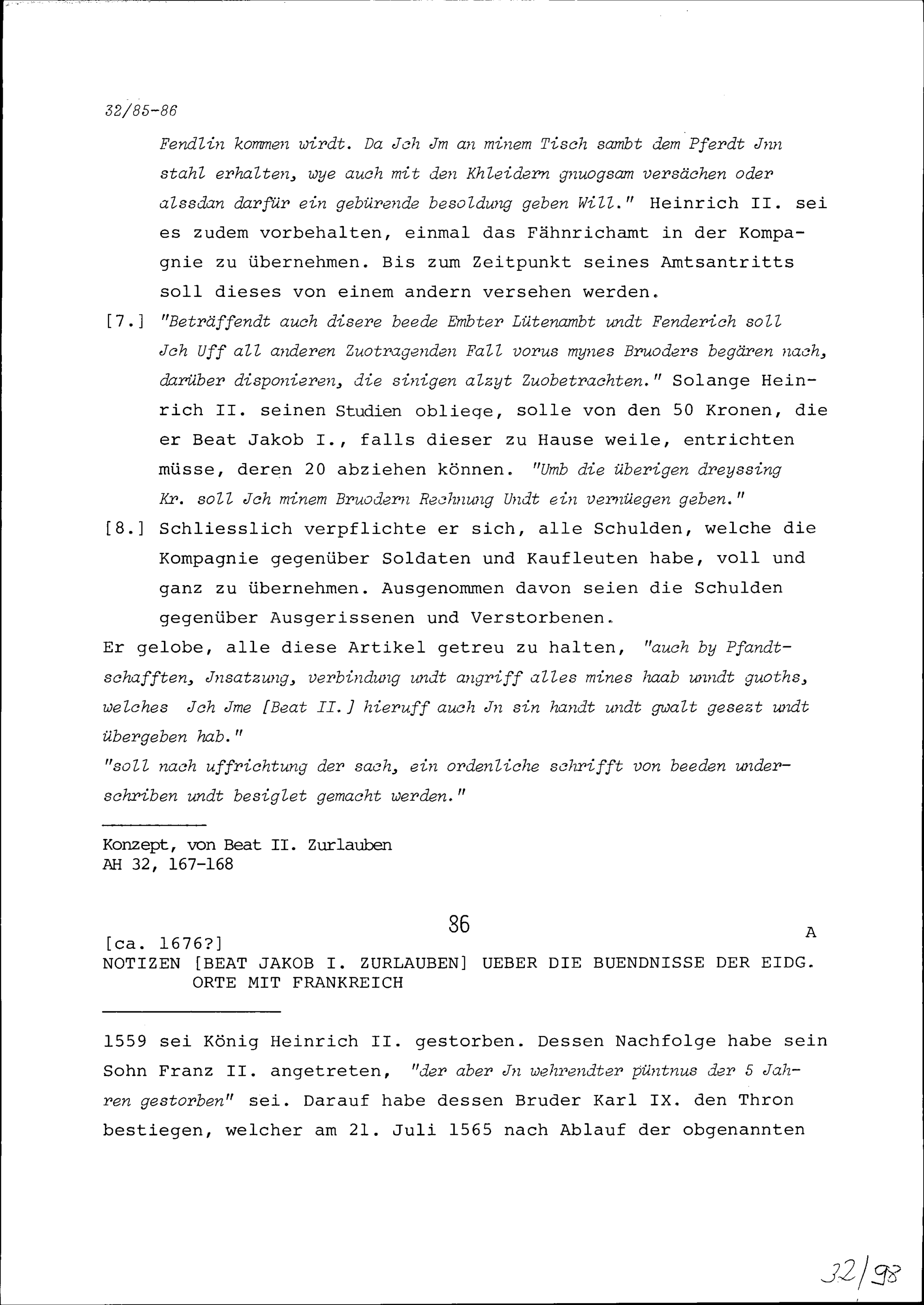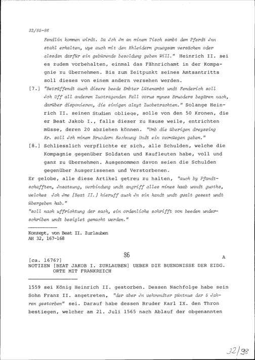 Vertrag über die Abtretung der Kompanie Zurlauben im Schweizer Garderegiment von Beat II. an Heinrich I. Zurlauben, seinen Bruder