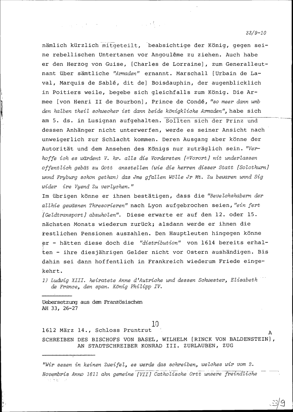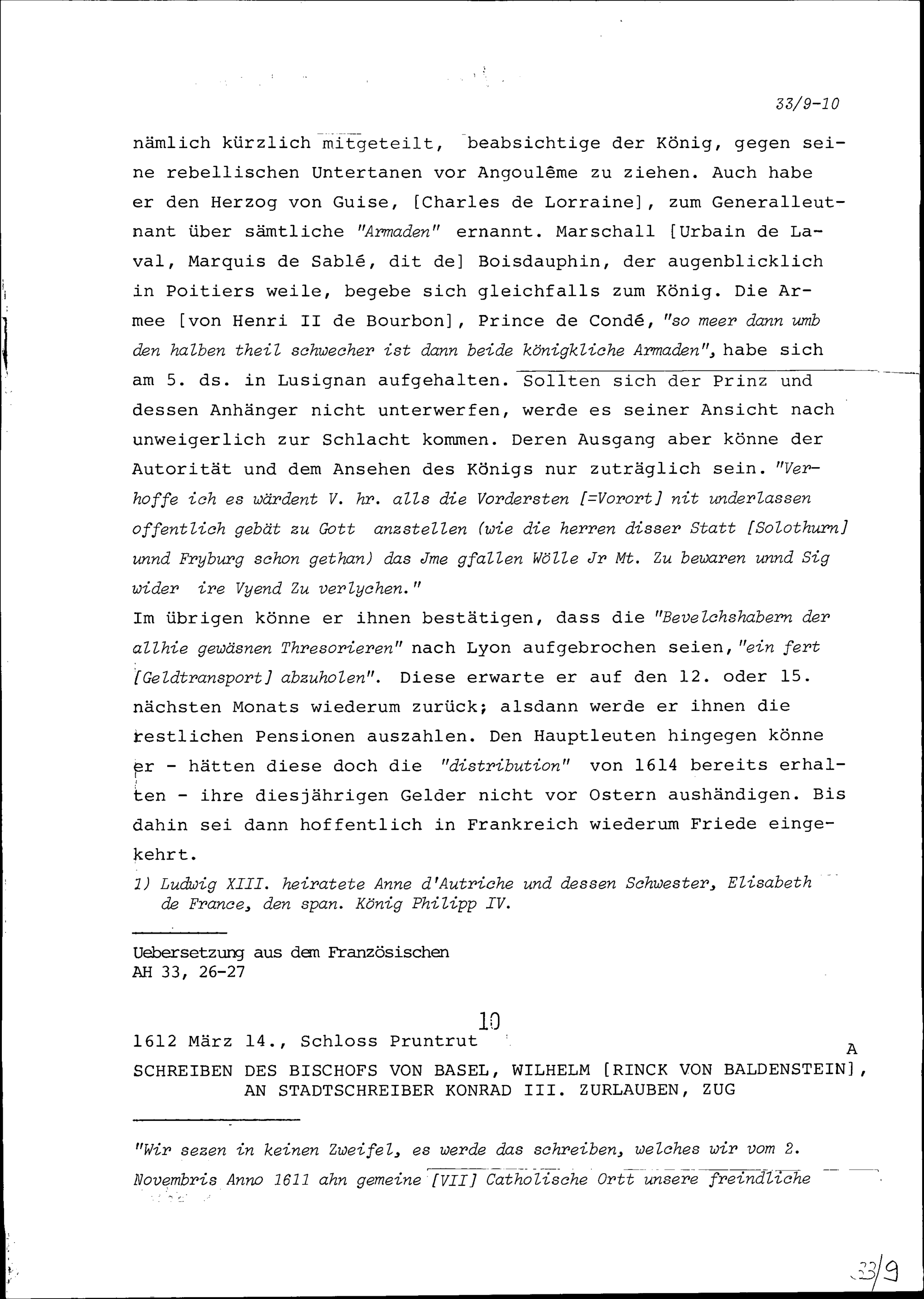 Schreiben von Pierre Jeannin de Castille, Ambassador von Frankreich, an Schultheiss...