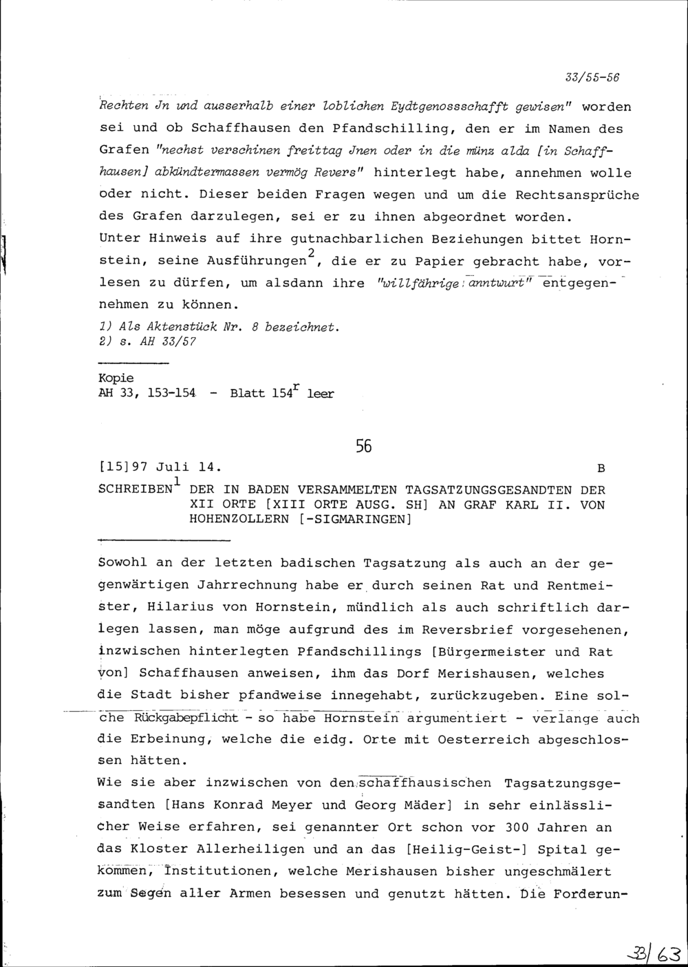 Einleitung des Vortrag von Hilarius von Hornstein, Abgesandter von Karl II., Graf von Hohenzollern-Sigmaringen, vor der Eidgenössischen Tagsatzung in Baden