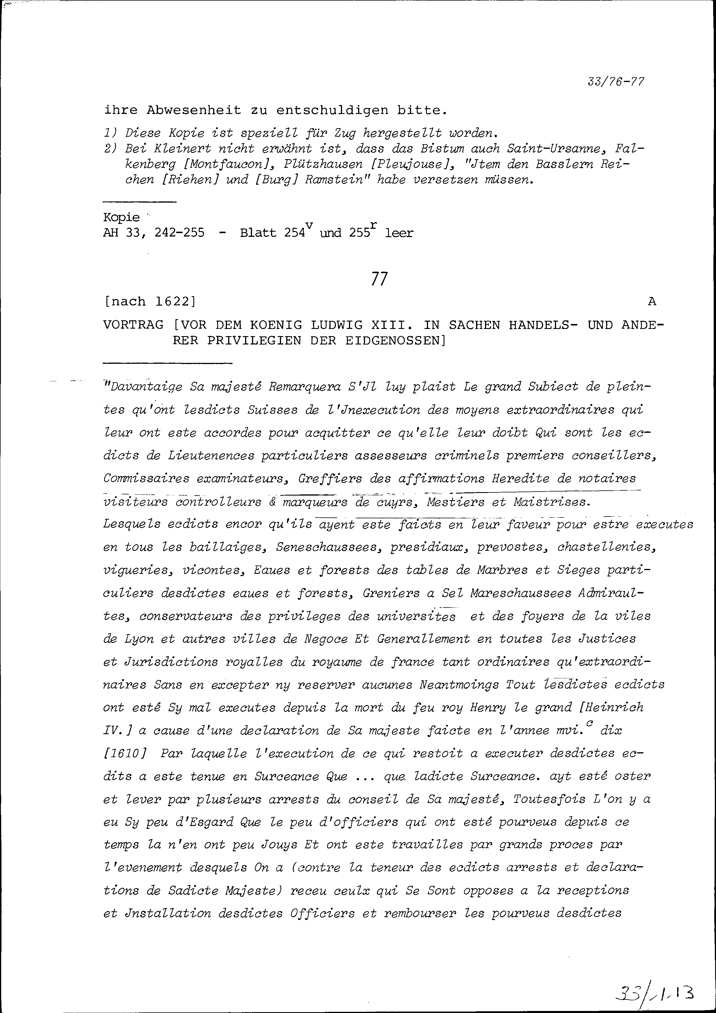Vortrag von Hans Wilhelm Reutner, Gesandter des Bischofs von Basel, worin er den Sieben Katholischen Orten auf der Tagsatzung in Baden darlegt, weshalb Jakob Christoph Blarer von Wartensee, Bischof von Basel, mit Bern in die Bieler Tauschverhandlungen eingewilligt habe