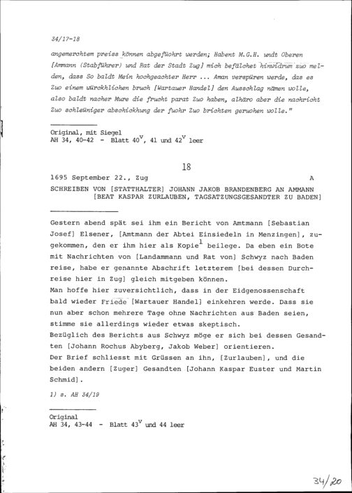 Schreiben von Wolfgang Vogt, Stadtschreiber, an Beat Kaspar Zurlauben, Ammann, Landeshauptmann der Freien Ämter und Tagsatzungsgesandter in Baden