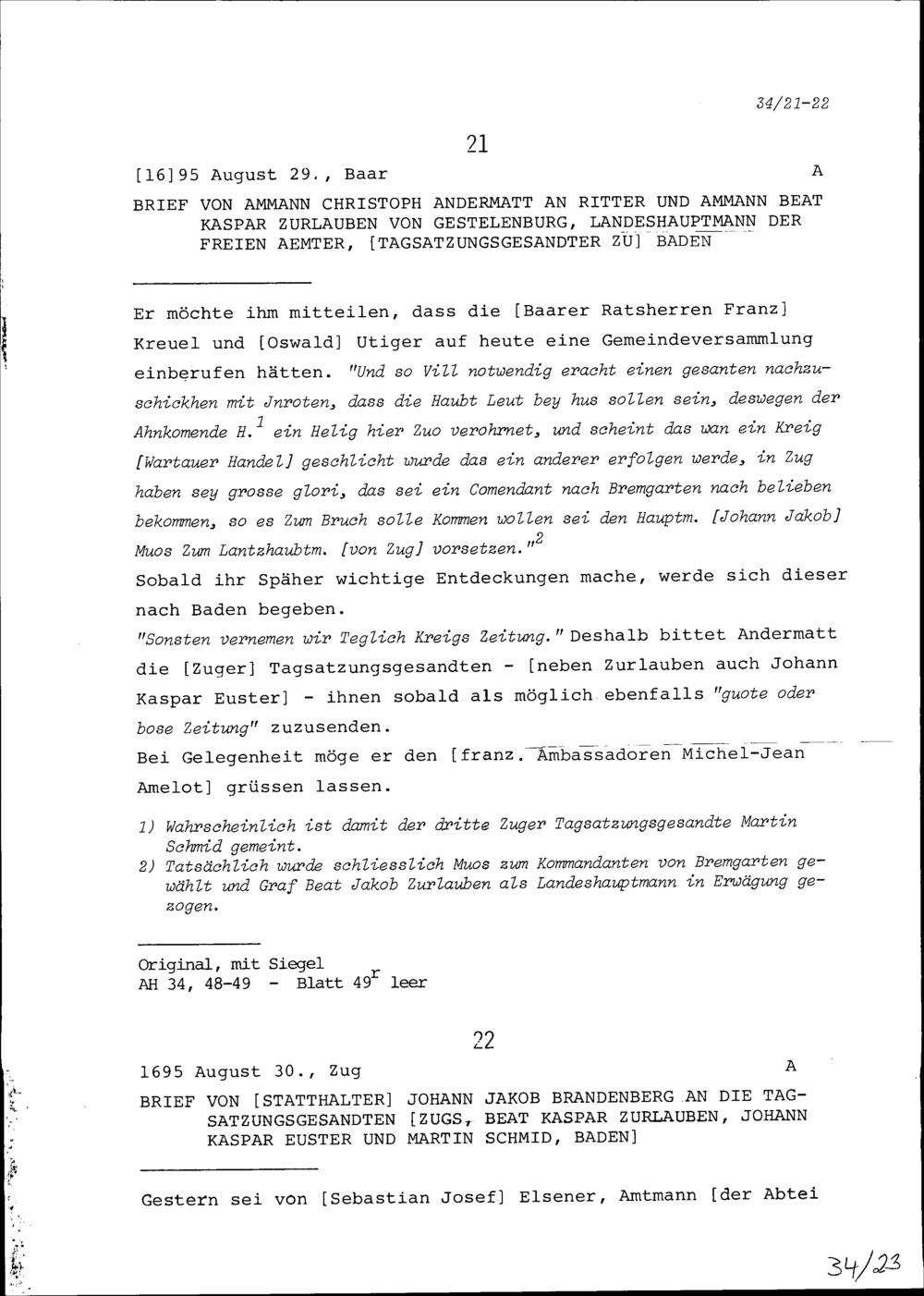 Schreiben von Johann Jakob Brandenberg, Statthalter, an Beat Kaspar Zurlauben, Tagsatzungsgesandter, an Johann Kaspar Euster, Tagsatzungsgesandter, und an Martin Schmid, Tagsatzungsgesandter, Baden