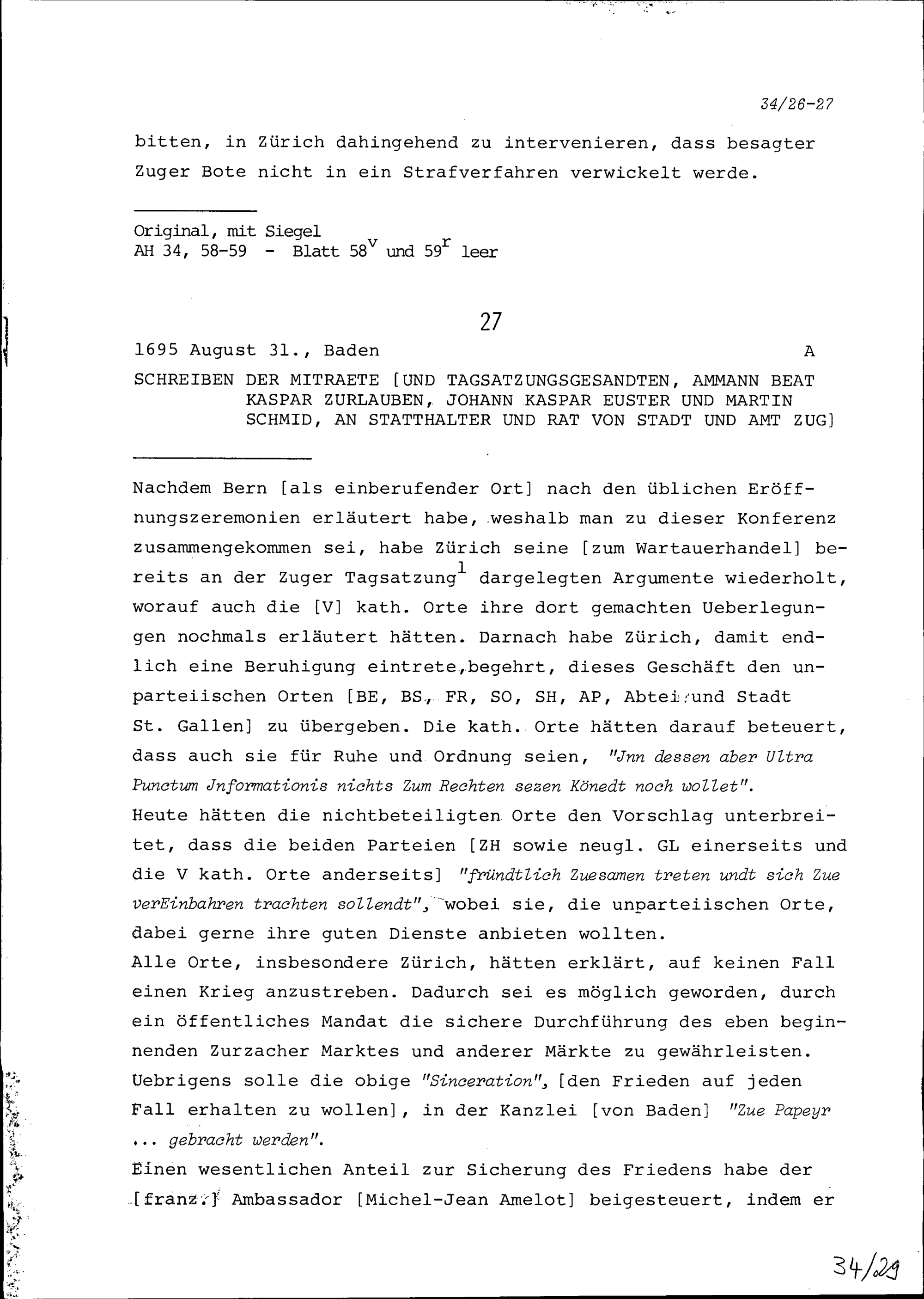 Schreiben von Wolfgang Vogt, Stadtschreiber, an Beat Kaspar Zurlauben, Ammann und Tagsatzungsgesandter in Baden