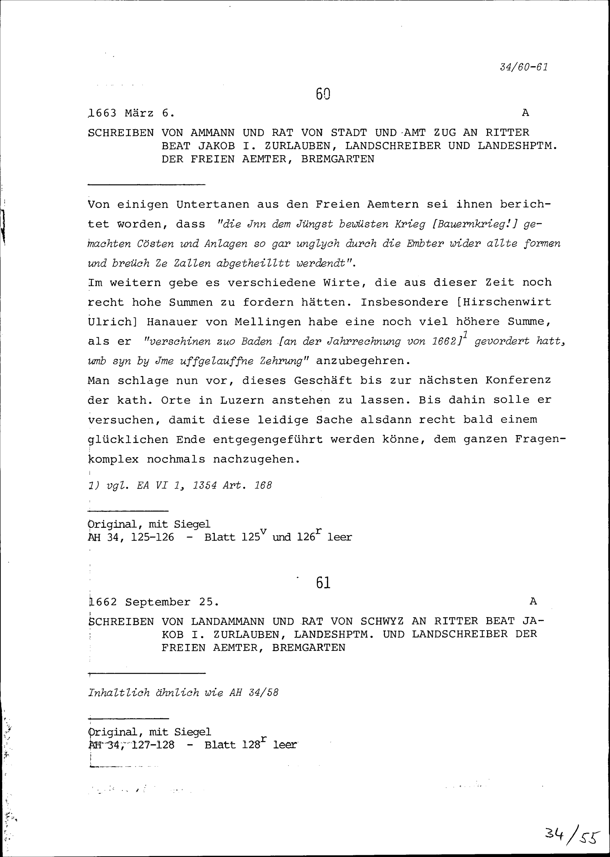 Schreiben des Landammanns und Rats von Schwyz an Beat Jakob I. Zurlauben, Landeshauptmann und Landschreiber der Freien Ämter, Bremgarten