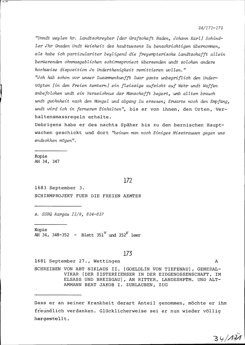 Schreiben von Nikolaus II. Göldlin von Tiefenau, Abt von Wettingen und Generalvikar der Zisterzienser in der Eidgenossenschaft, im Elsass und Breisgau, an Beat Jakob I. Zurlauben, Landeshauptmann und Altammann, Zug